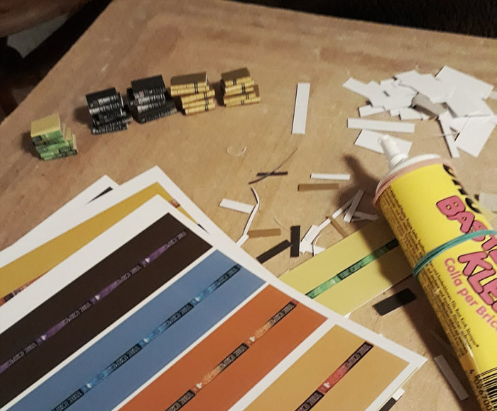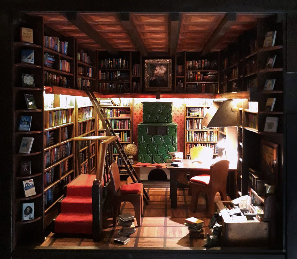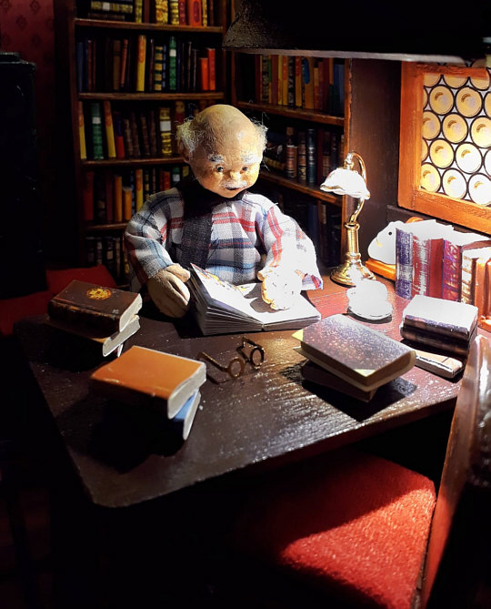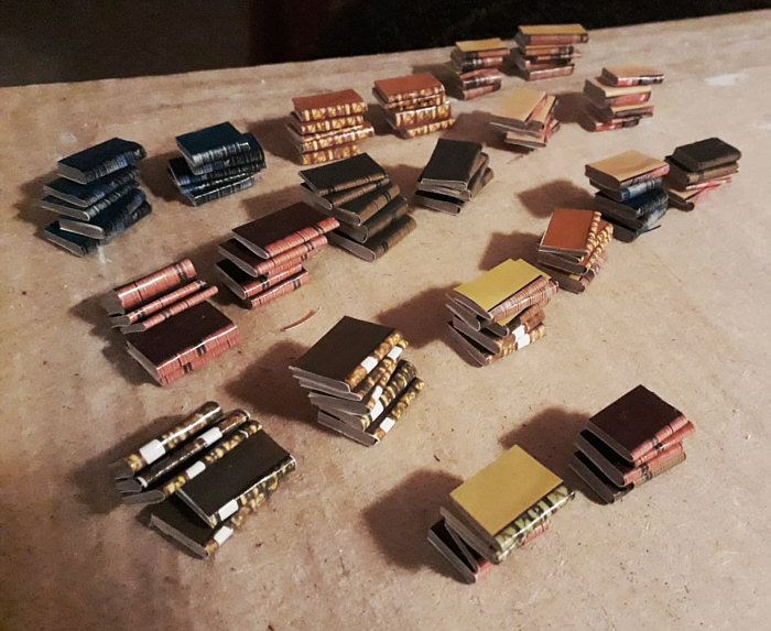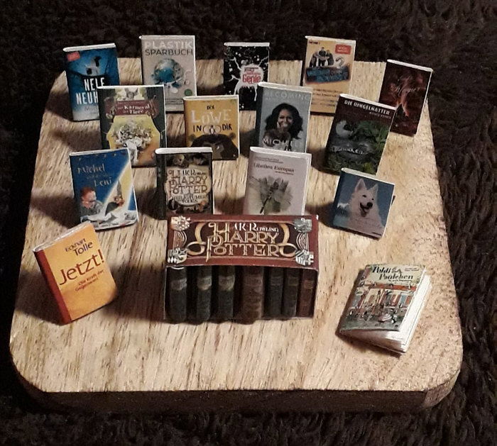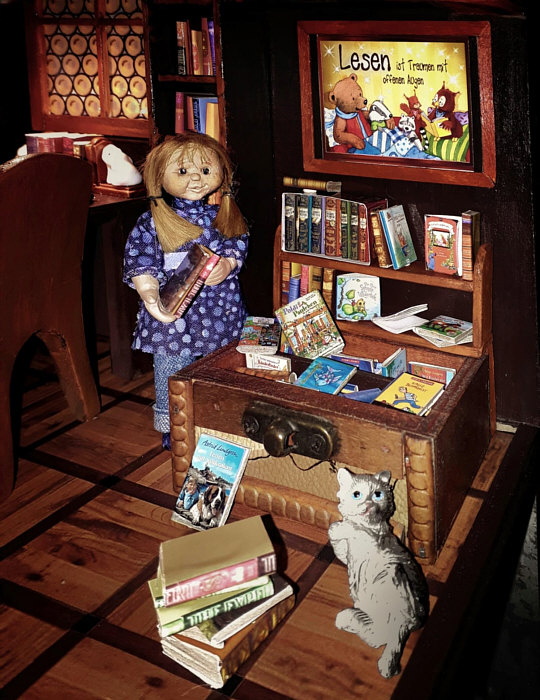 Ihr könnt Euch doch ganz sicher noch an dieses ... ![]() ... Puppenhaus erinnern ... ich hab Euch immer noch nicht gesagt, wer das Haus gebaut hat ... dabei ist die Person sogar fast prominent. Aber auch heute sage ichs noch nicht ... aber das nächste Mal. Es geht weiter mit dem Puppenhaus ... wie, das ist doch fertig und komplett ? Ja ... aber ... das Haus steht auf einem Schrank ... ![]() ... und dort sind vier Fächer drin ... die werden auch noch eingerichtet. Oben rechts ist schon fertig ... und wir dürfen heute gucken :)). Und zwar Schritt für Schritt ... es begann ... ![]() ... mit viel Karton und Schere ... ![]() ... und dann kamen Ausdrucke dazu und Kleber. Viele kleine Bücher entstehen so ... ![]() ... ganz echt aussehende Miniaturbücher: ![]() Was könnte also in dem neuen Zimmer zu sehen sein ? Richtig ... eine kleine Hausbibliothek ... und nun Tusch ... ich zeige sie in ganz groß: ![]() Und kurz darauf zogen schon die ersten Bewohner ein: ![]() ![]() |