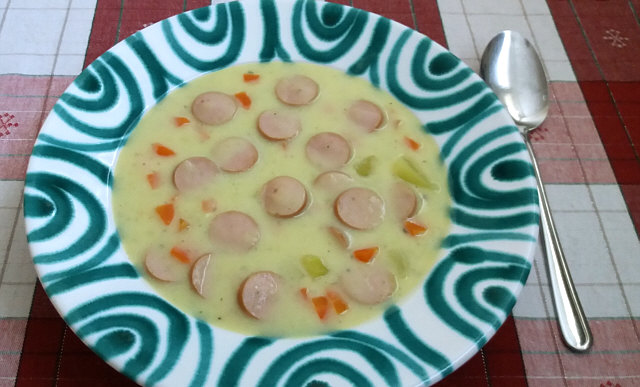 Passierte Kartoffelsuppe mit Karotten und Würstchen