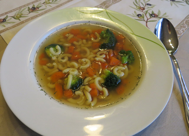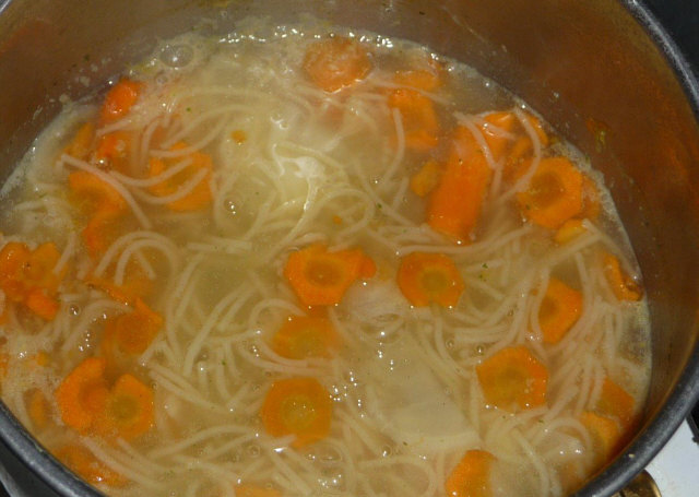 Das ist eine einfache Gemüse-Nudelsuppe mit etwas Karotten und
