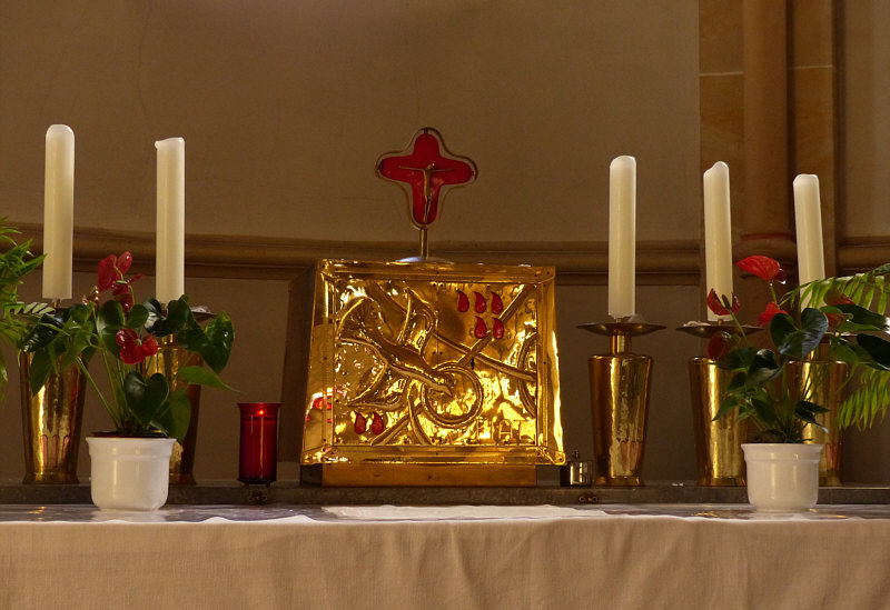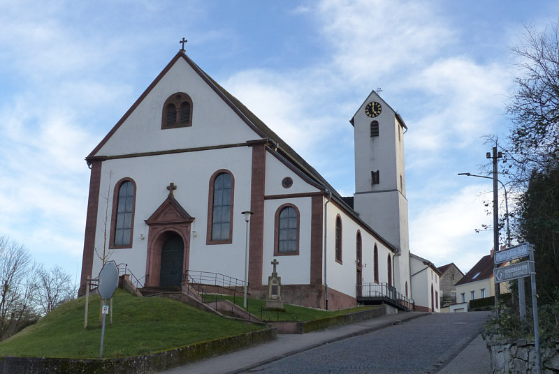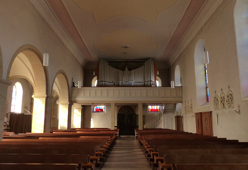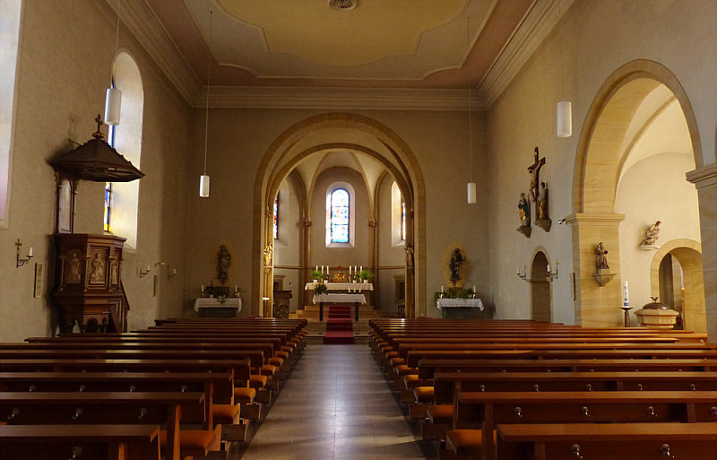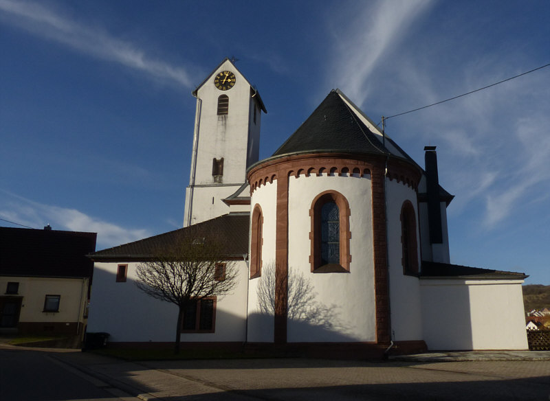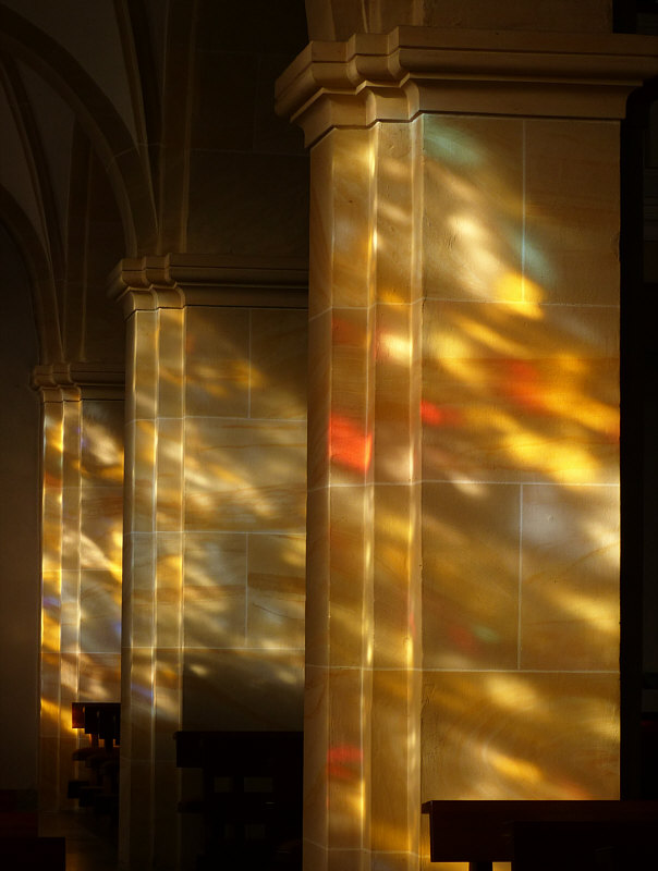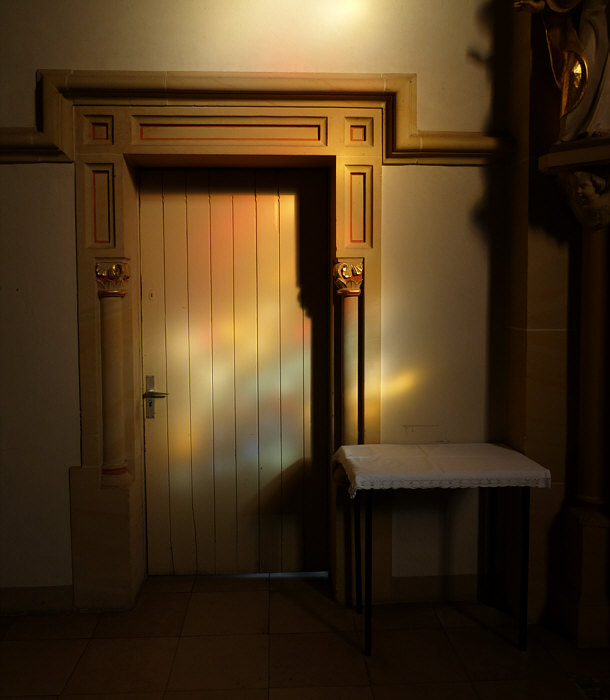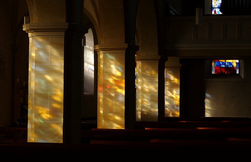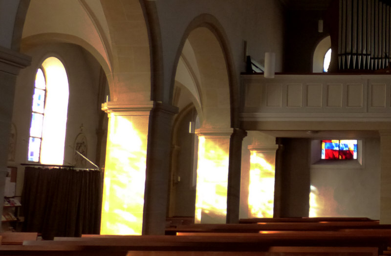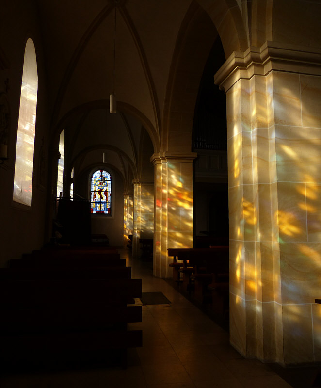 Am Samstag Nachmittag stand ich vor dieser Kirche: ![]() Ich hab dieses Bild fotografiert, falls das die Sonntagskirche werden würde. Aber ich habe nicht damit gerechnet, dass die Kirche offen ist. Aber falls doch, dann wollte ich nicht nochmal zurück laufen und das Bild machen, darum habe ich das mal fotografiert ... für den Fall ... und dann ... ![]() ... die Tür da rechts auch verschlossen. Aber ... oh Wunder ... die nächste Tür da links, zu erreichen über eine tolle neue behindertengerechte Rampe, war offen ... und hinter der Tür ... ![]() ... gab es einen halbkreisförmigen Vorhang aus schwerem Stoff als Windschutz. Ich trat in die Kirche ein ... und war verzaubert. Warum, erzähle ich gleich ... auf jeden Fall war diese Kirche dann tatsächlich ... ![]() ... die gestrige Sonntagskirche. Ich ging nach vorne zum Altar ... ![]() ... und blickte von dort aus zurück: ![]() Auf diesem Bild sieht man schon, was mich verzaubert hat ... aber man erkennt es nicht. Das hat belichtungstechnische Gründe ... weil ich die dunkleren Bereiche heller fotografiert habe, verlieren die hellen Bereiche leider ihre Details ... denn an diese Pfosten ... ![]() ... warfen die Fenster wunderbare farbige Muster: ![]() Das nun folgende Bild ... ![]() ... war das, was wir nach dem Betreten der Kirche zuerst gesehen haben ... welch ein Zauber. ![]() ![]() Als wir dann wieder nach draußen gingen ... fanden wir sogar einen ... ![]() ... Türöffner an der Wand ... welch ein Service. Wieder draußen konnte ich während des Spaziergangs noch zwei weitere Außenbilder fotografieren: ![]() ![]() Wir waren in ... ![]() ... das ist ein kleiner 735-Seelen-Ort im südlichen Saarland. |