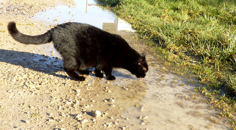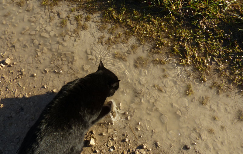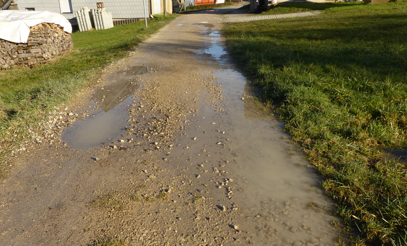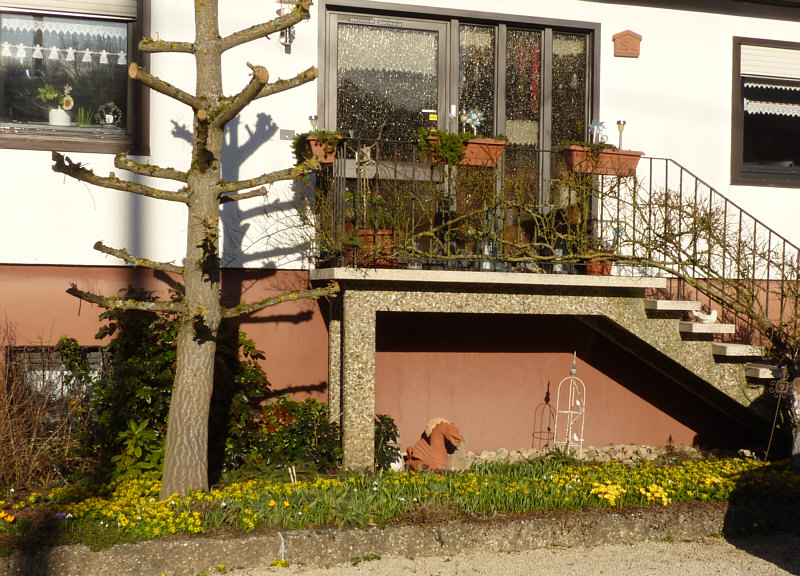 Kommt doch mal mit ... ... beim Spaziergang in Rubenheim. Hier ... ![]() ... haben wir eine kurze Pause gemacht und jetzt laufen wir weiter. Aber nur mit den Augen ... denn eigentlich bleibe ich ja stehen und zoome einfach das, was mich interessiert, näher rau, Denn dort vorne am Haus ... da ist ein Kunstwerk ... welcher Art auch immer. ![]() Zuerst mal fällt auf, dass die Autos vorm Auto irgendwie in der zweiten Etage stehen. Als würden sie auf der Garage oder auf einem Laster stehen. Seltsam ... ist aber nicht aufzulösen, weil ich ja nur gezoomt habe, aber nicht gelaufen bin. Zurück zum Bild ... irgendjemand sitzt auf dem Pferd und irgendwie scheint es dramatisch zu sein. Bitte noch näher ran, auch wenn ich nicht weiß, ob ich das so genau sehen will ;). ![]() Ein dramatisches Fantasy-Gemälde von einem Kampf gegen den Drachen. Ziemlich brutal ... aber richtig klasse gemalt. Ist das Beethoven auf dem Pferd ? Nein, sicher nicht ... aber das Tata ta ta würde hier gut passen. Lass uns mal Ausschau halten, ob wir etwas thematisch leichteres finden ... und jawoll ... ... ein paar Häuser ist ein Vorgarten genau das Gegenteil ... eine friedlich blühende Oase: ![]() ![]() Hier blüht es in großer Menge und es summt und brummt. ![]() ![]() ![]() So ein Winterling, mal solo in Szene gesetzt, ist auch eine richtig schöne Blume. Neues Haus, neue Malerei ... ![]() ... aber eine, die ganz anders ist als eben: ![]() Auch richtig gut gemacht. Unser Weg führt uns nun kurz aus dem Ort hinaus, an alten Streuobstwiesen entlang: ![]() Sehr alte Obstbäume ... manche ... ![]() ... über und über mit Misteln bedeckt. ![]() Hast du gewusst, dass Misteln ... ![]() ... viele weiße Beeren haben ? Der Weg wird nun feuchter ... ![]() ... auf der Wiese stehen Pfützen ... ![]() ... und auf dem Weg auch ... aber da dieser steinig ist ... ![]() ... kann man gut gehen und der Untergrund ist fest und nicht schlammig. Schönes Fotomotiv ... herrliche Steinstrukturen ... ![]() ... mit Wasser bedeckt ... das leicht milchig ist und trotzdem den Blick freigibt. Ein ganz außergewöhnliches Fotomotiv. Huch ... ![]() ... wer tapst denn da ins Wasser rein ... du wirst doch nicht ... doch du wirst ... ![]() ... doch tatsächlich aus dieser Pfütze trinken. Dieser ... wahrscheinlich Kater ... ![]() ... war auf einmal da ... brummte laut und ließ sich intensiv von Beate kraulen. Am liebsten hätte sie ihn mit heimgenommen, denn Beate und schwarze Katzen sind Seelenverwandte. Ja, wo laufen sie denn ... ja, wo laufen sie denn hin ... ![]() ... das ist ne Laufente ... ihr Lieblingsessen: Schnecken und Schneckeneier. Leider werden viele Laufenten gehalten ohne Badegelegenheit. Weils so schön ist ... bzw. weil sie so schön sind, gibts noch zwei weitere Bilder: ![]() ![]() Dieses Bild ist für heut das allerletzt denn liebe Leut' 's wird fortgesetzt :)). |