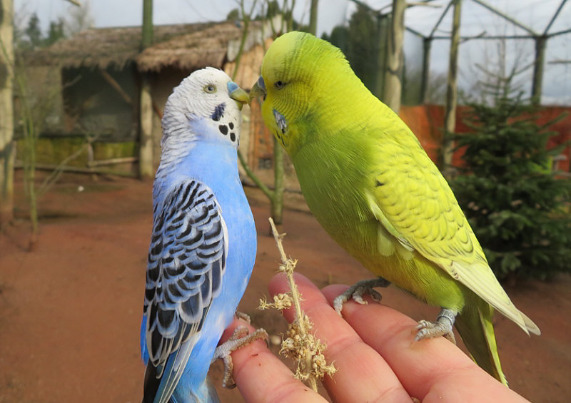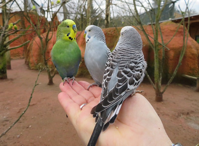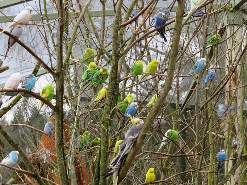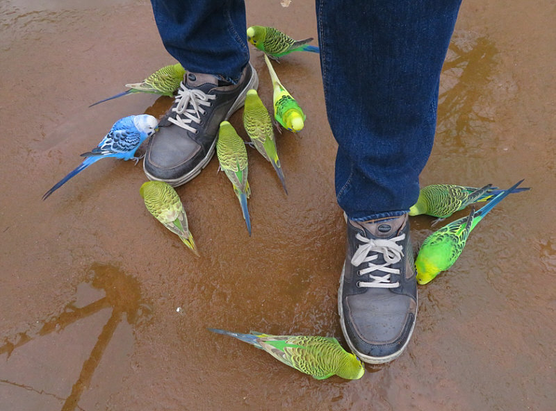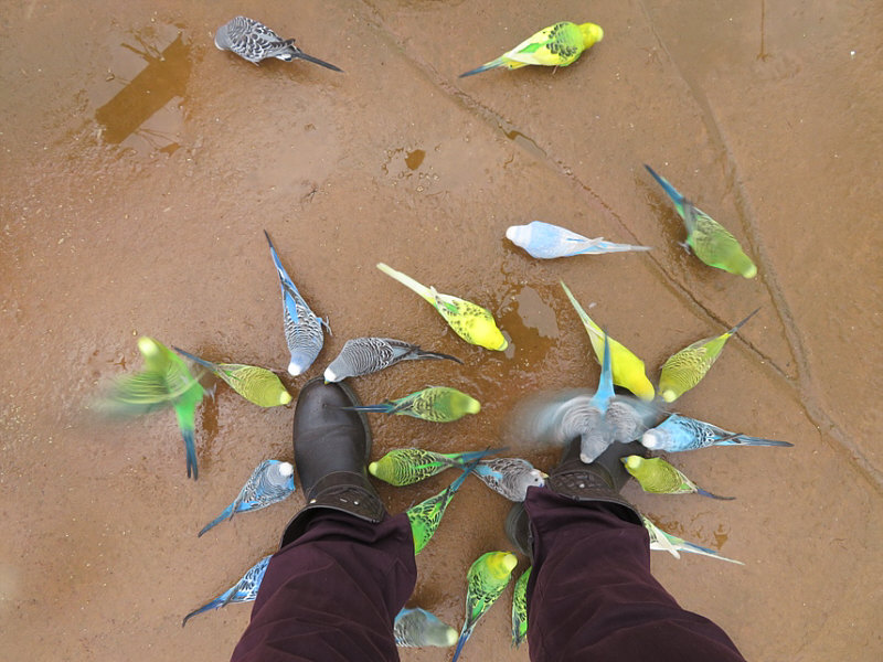 Wenn ich Sabine P. frage "bist du Hunde- oder Katzenfreund ?", dann bekomme ich die Antwort "ich bin Vogelfreund". Sabine hat ja selbst zwei Wellis daheim. Und als Vogelfreundin hat sie die begehbare Voliere des Vogelparks in Marlow sehr gerne besucht. Wir sind also in Meck-Pomm :). Als erstes begegnet uns dieses Schild: ![]() Wie ... treten ? Vögel fliegen doch ... Menschen fliegen nicht ... wie können diese denn auf die Vögel treten ? Und so treten wir ein ... und bleiben stehen: ![]() Die Wellensittiche kommen in Mengen angeflogen, direkt auf die Schuhe zu. Sie sind ganz verrückt auf Schuhe und alles, was sich daran befindet. ![]() Und da es zwischendurch auch mal regnet, ist der sandige Boden feucht und dementsprechend sahen dann auch unsere Schuhe bzw. Stiefel aus ;)). An einem Automaten können wir Körner zum Füttern kaufen. Sabine brachte Kolbenhirse mit, weil ihre Vögel die besonders mögen. Nicht nur ihre ... kaum hatte sie die Hirse in der Hand, gings im Vogelpark auch schon los: ![]() ![]() Selbstverständlich fotografierte Sabine so einige Bilder dort: ![]() ![]() ![]() ![]() Wellensittiche sind ja Schwarmvögel und deshalb sollen sie auch nicht alleine gehalten werden. Es gibt dort auch noch andere Vögel ... ![]() ... wie diese Zebrafinken. Die sind wegen ihrer Gesangskünste besonders beliebte Haustiere. Relativ pflegeleichte Tiere, die man auch in einer größeren Gruppe halten sollte. In dem Vogelpark gibt es auch noch Kamele, Flamingos, Kängurus, Aber wir kommen ja erstmal nicht von den Wellis los, die uns so liebevoll umlagern :)). |