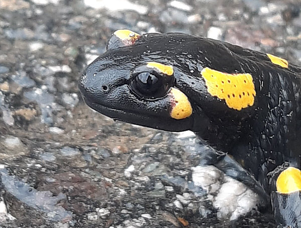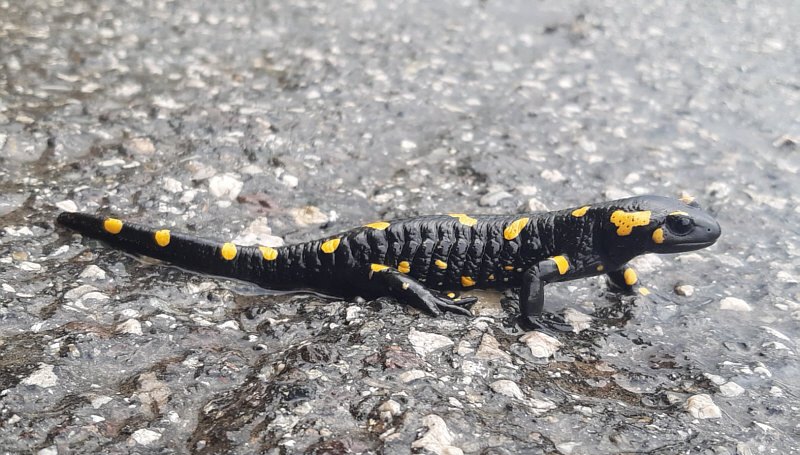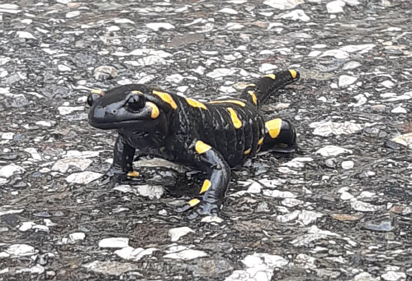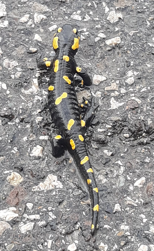 Heute wirds schwarz mit gelb hier. Nein, es geht nicht um eine Koalition der CDU mit der FDP. Auch wenn manchmal Parteien ziemlich hilflos am Boden krabbeln. Heute krabbelt auch jemand, aber nicht hilflos. Sondern mit lurchiger Erhabenheit. Ich selbst habe noch nie einen gesehen ... man sagt Feuermolch, Erdmolch, Erdsalamander, Regenmolch, Regenmännchen, Gelber Schneider, Bergnarr, Wegnarr, Regemolli oder Tattermandl zu ihm. Oder, so ist die offizielle Bezeichnung, Feuersalamander. Er wäre ja einfach so seines Weges gegangen, aber dann kam Sr. Maria mit ihrem Handy vorbei. Und so kommen wir in den Genuss der heutigen Bilder: ![]() ![]() ![]() ![]() |