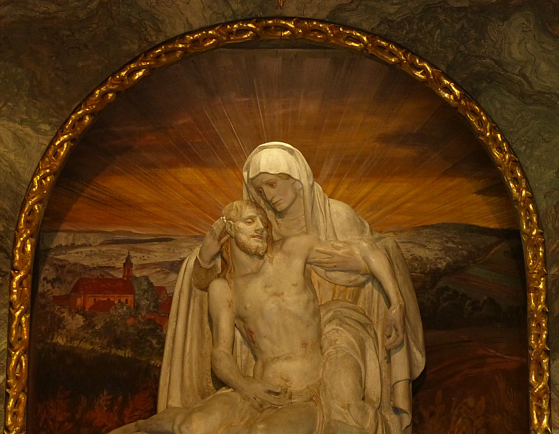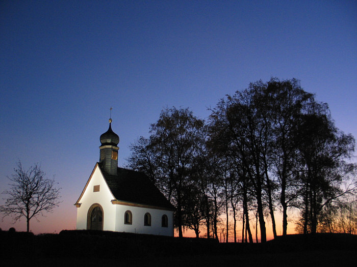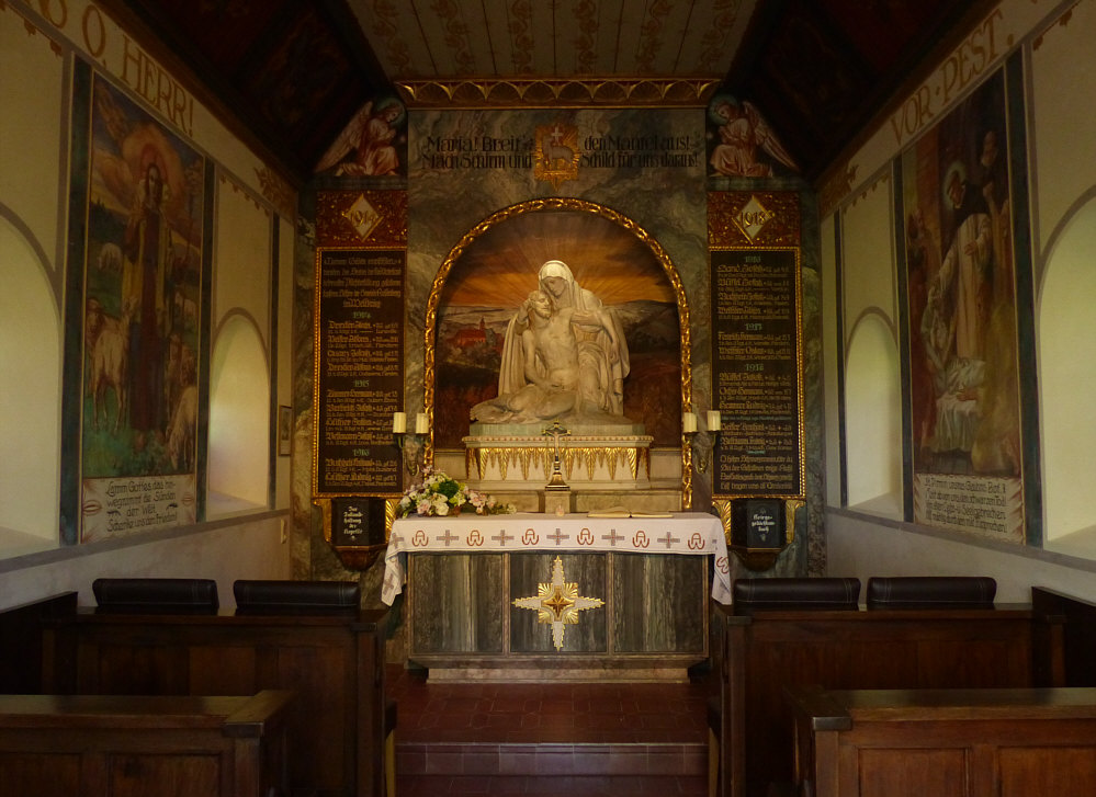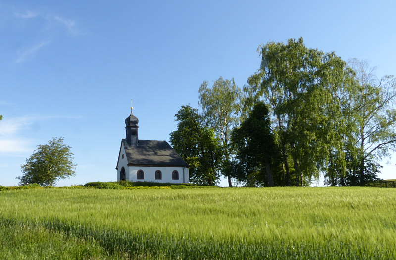 Im Seelenfarbenkalender ist ja dieses Bild zu sehen: ![]() Ich weiß, wo die Kapelle steht, hab das Bild ja selbst fotografiert. Aber dort komme ich so gut wie nie vorbei ... denn meistens nehme ich Schnellstraße, wenn ich von Süden aus Richtung Heimat fahre. Außer vor ein paar Tagen ... da bin ich zufällig mal wieder dort vorbeigekommen. Und das nicht im November und am Abend, sondern im Mai und am Tag: ![]() Diesmal war die Kapelle auch geöffnet. ![]() ![]() Nach unserer Andacht setzen wir uns auf diese Bank ... ![]() ... und genießen den Blick, den wir von der Bank aus haben: ![]() Wir sind heute in der 1925 gebauten Kriegergedächtniskapelle auf dem Häselberg östlich des Ortes Reifenberg. Originalton Wikipedia ... "Die 1925 erbaute Kriegergedächtniskapelle wird aufgrund ihrer malerischen Lage auf dem Häselberg gerne fotografiert und zierte schon mehrfach Kalenderblätter. Stimmt ;)). Willkommen in der Sonntagskirche von Seelenfarben :)). Deine Gedanken zur Kirche und zum Kircheninnenraum ? |