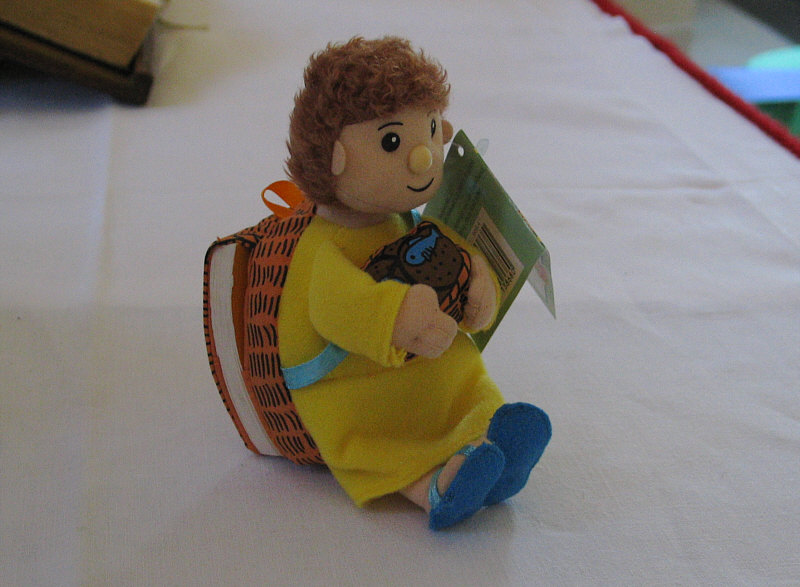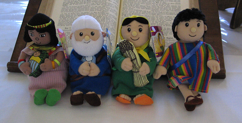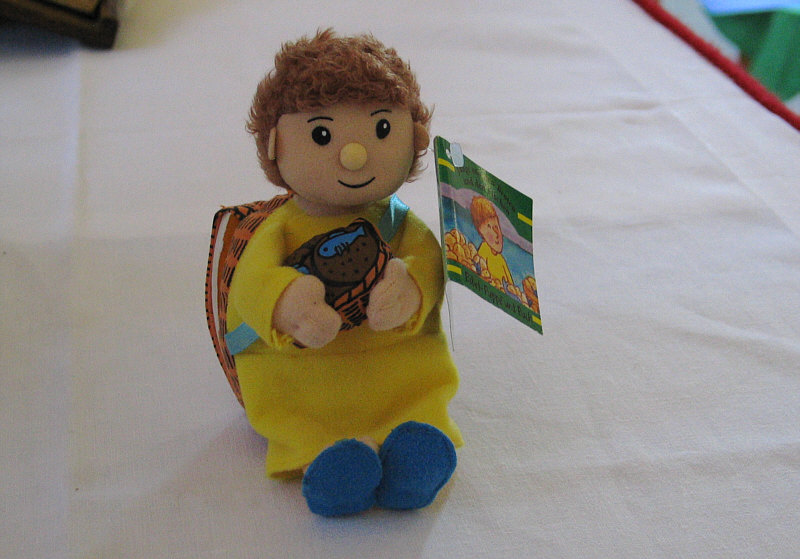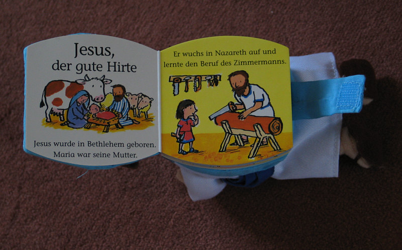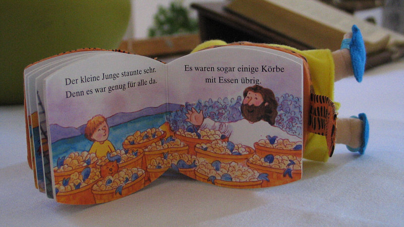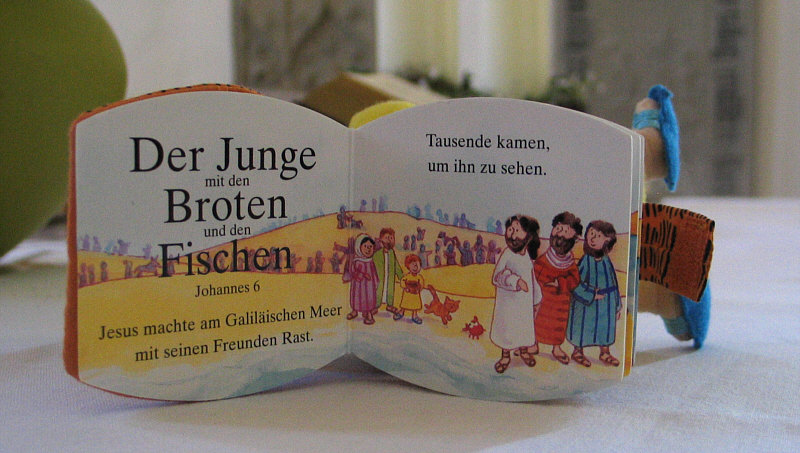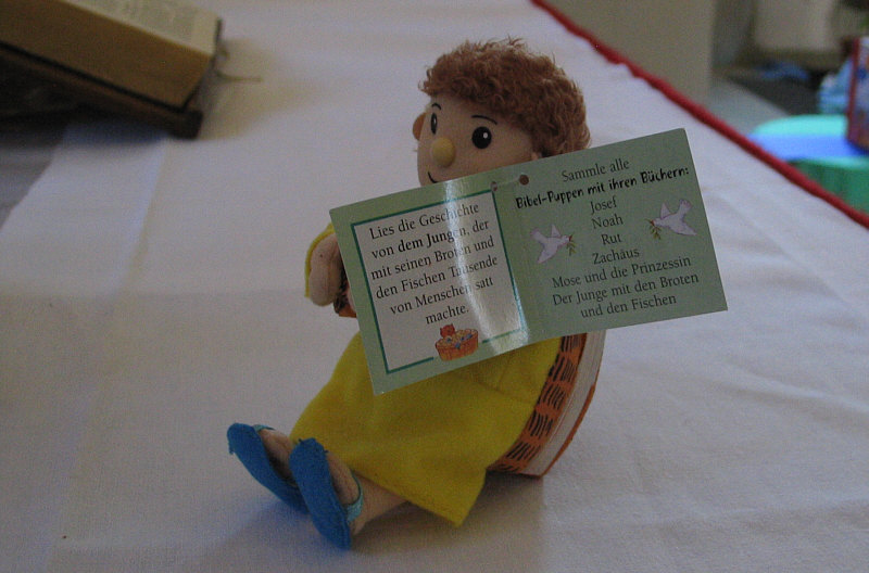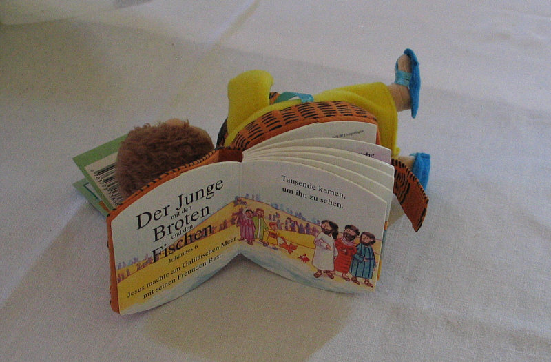Wir sind immer noch hier ... ![]() ... in der Michaeliskirche in Kürnbach. Denn damals hatten wir nicht nur diese tolle Pfingstgemeinschaft der Kinder entdeckt, sondern noch etwas, von dem wir nicht wussten, dass es das überhaupt gibt. Kleine Puppen ... ![]() ... Bibelpuppen. ![]() Da gibt es Josef Noah Rut Zachäus Mose und die Prinzessin und diese hier ... ![]() ... Der Junge mit dem Brot und den Fischen. Auf dem Rücken ... ![]() ... tragen die Puppen, die 16 cm hoch sind, einen Rucksack ... ![]() ... der gleichzeitig ein kleines Bibelbuch ist. Dort wird die jeweilige biblische Geschichte in einfachen Sätzen ... ![]() ... und mit ansprechenden Bildern nacherzählt. ![]() Gedacht für Kinder zwischen 3 und 7 Jahren. Hier vier weitere Puppen --- ![]() Von links: Prinzessin mit Mose im Weidenkörbchen, Noah, Rut, Josef Den Cheffe gibts natürlich auch ... ![]() ... sogar mit Lamm ... ![]() ... denn er ist ja ein guter Hirte. |