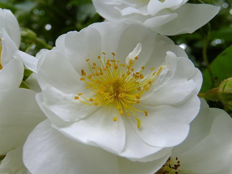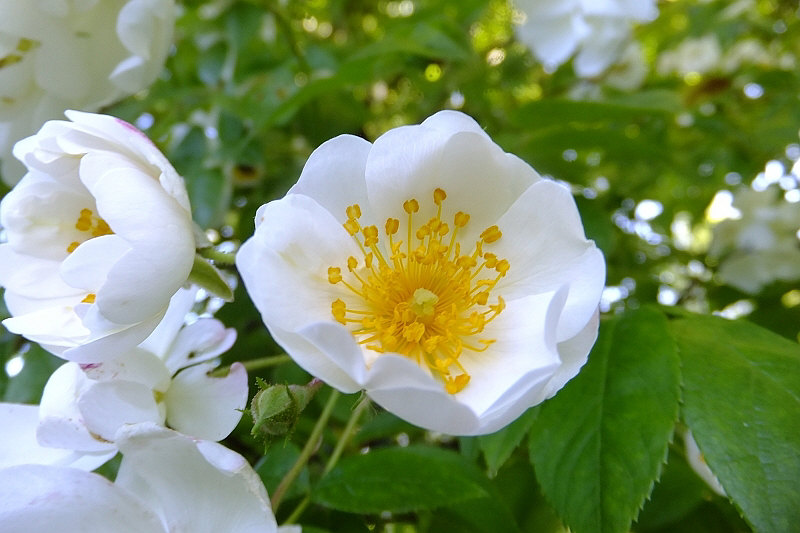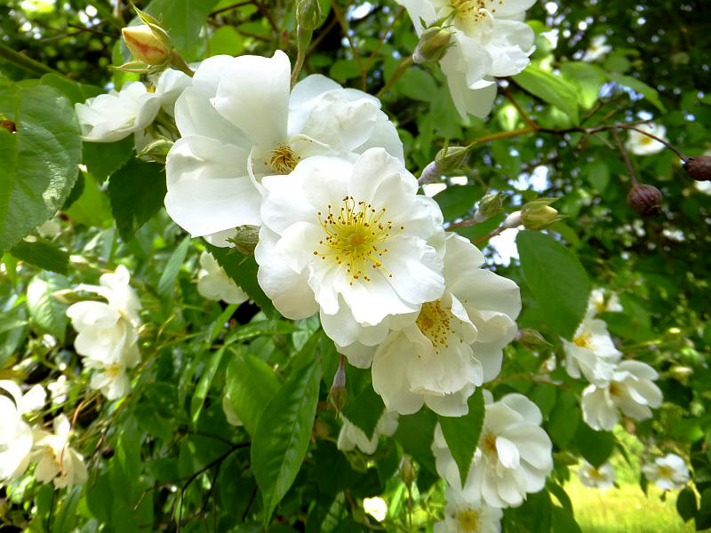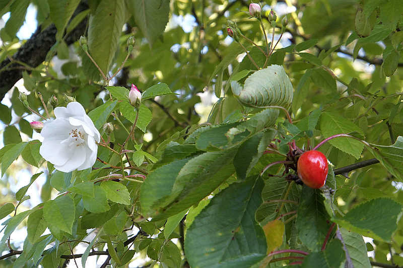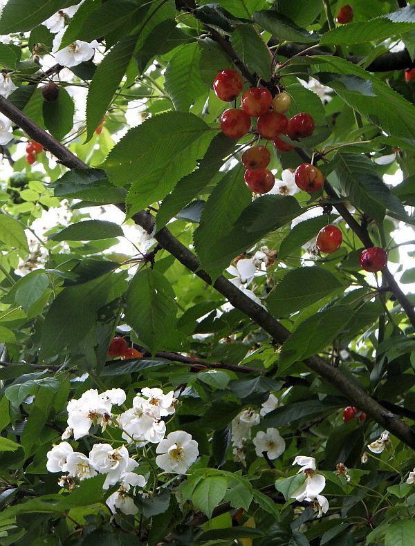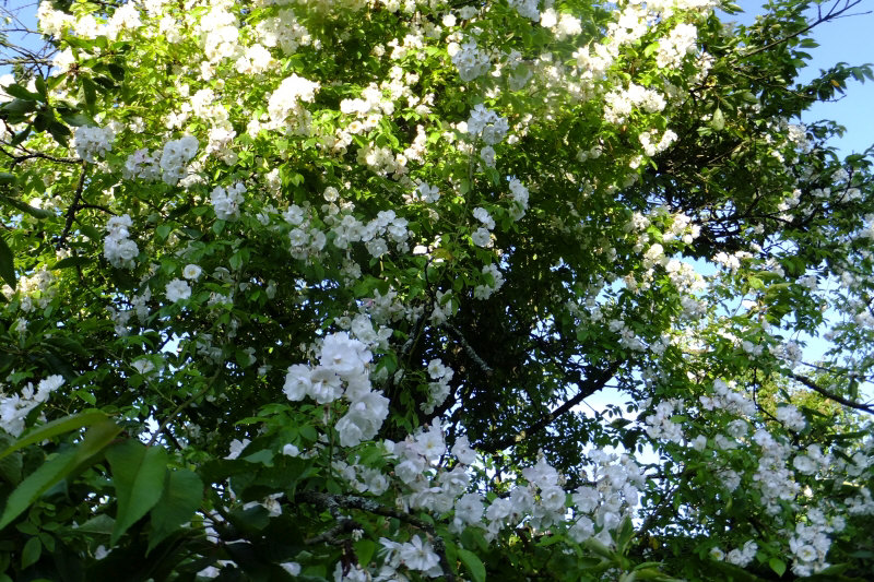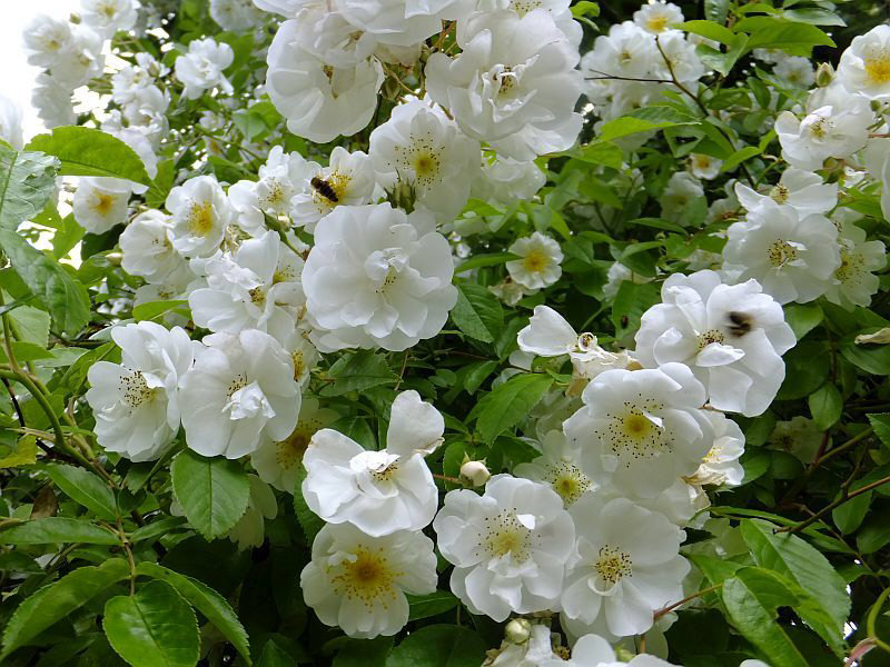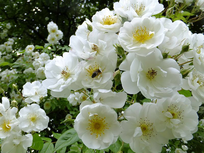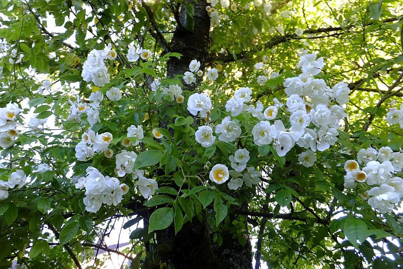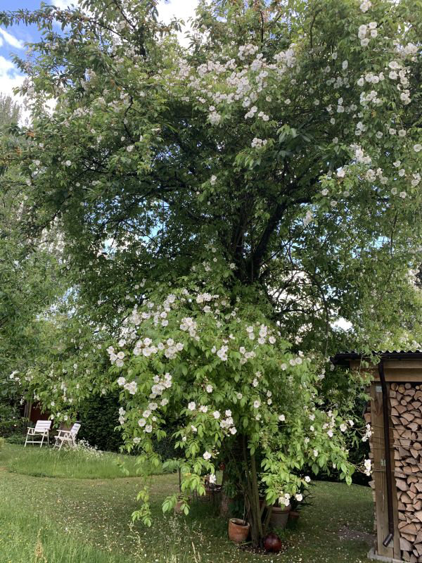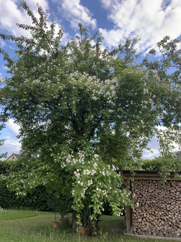 Lieber Engelbert ... ... vor 40 Jahren hat uns mein Vater für unseren Garten zwei Kirschbäume geschenkt: Eine Süß- und eine Sauerkirsche. Sie wuchsen heran, trugen aber nicht sonderlich gut und sahen auch recht mickrig aus. Irgendjemand erzählte uns, sie würden durch den störenden Einfluss von Wasseradern nicht richtig gedeihen (dass sich eines Tages herausstellte, dass es tatsächlich in unmittelbarer Baumnähe Wasser gibt, ist dann eine andere Geschichte). Dann wurden die Bäume irgendwann auch noch von Monilia, einem Pilz befallen. Das hatte zur Folge, dass die Blätter schon im Juli gelb wurden und vom Baum fielen. Herbstfeeling mitten im Sommer. Bevor sie der Säge zum Opfer fallen sollten, bekamen sie noch eine Chance, denn ich hatte in einer Gartenzeitung von der Berankung mit Rambler-Rosen gelesen. Also machte ich mich schlau und stieß auf "Bobby-James", eine Rambler-Rose, die eine Wuchshöhe von bis zu 10 m erreicht! Genau richtig für den großen Süßkirschbaum! Ein Versuch war es wert, er war erfolgreich und hat den Baum vor dem Fällen bewahrt! Die Rose hat sich ihren Platz inzwischen mit dicken Trieben bis hoch in die Krone erobert und verhilft dem Kirschbaum jedes Jahr im Juni zu einer zweiten weißen und unglaublichen Blütenpracht. Er sieht während der Blütezeit wie ein riesiger Blumenstrauß im Garten aus und lockt Bienen in hellen Scharen an. Es summt und brummt den ganzen Tag bis zum Einbruch der Dunkelheit unaufhörlich. Einfach nur schön! Und noch etwas Gutes hat Bobby vollbracht: Der alten Kirsche bekommt das Zusammenleben mit der Rose anscheinend so gut, dass sie in den letzten Jahren fast immer reichlich Kirschen trägt, falls der Frost nicht gerade ausgerechnet zur Blütezeit zuschlägt, was leider hin und wieder mal vorkommt. Dieses Jahr haben wir besonders viel Glück und werden uns (vorausgesetzt der jetzige Regen hat die Früchte nicht alle platzen lassen) über soviel Kirschen wie noch nie freuen können. D.h. wir eigentlich weniger, denn die Vögel haben schon längst ein Auge auf die reif werdenden Kirschen geworfen. Vielleicht ist Bobby-James ja etwas für's Kalenderblatt? |