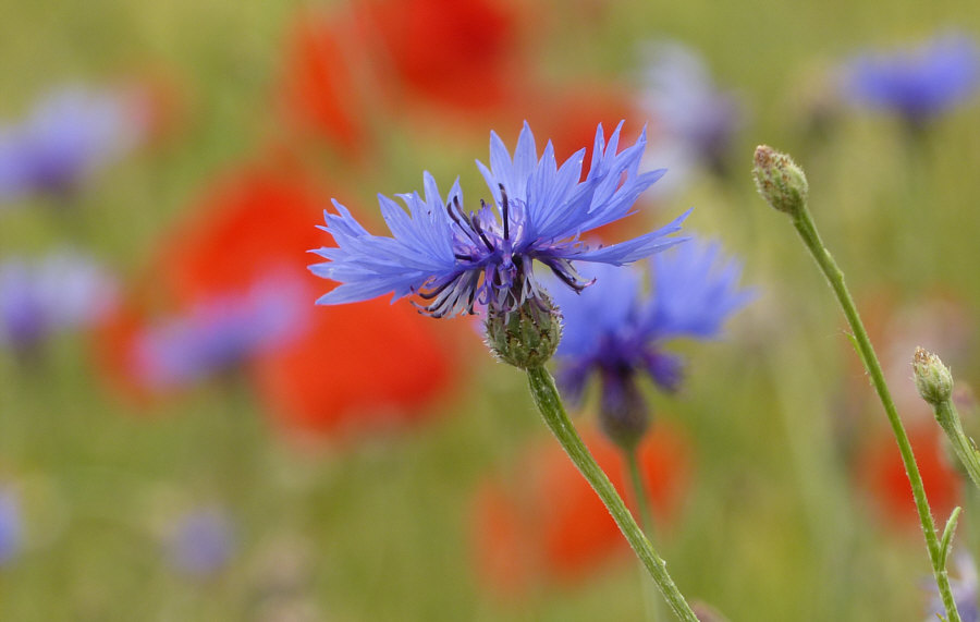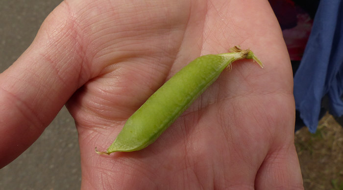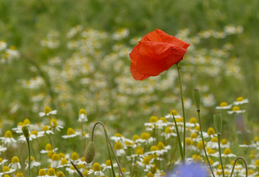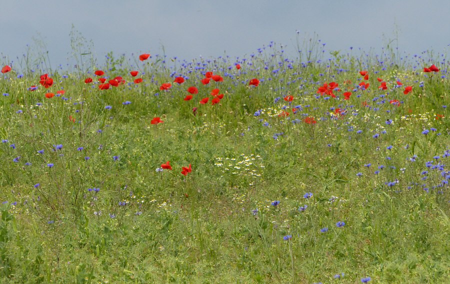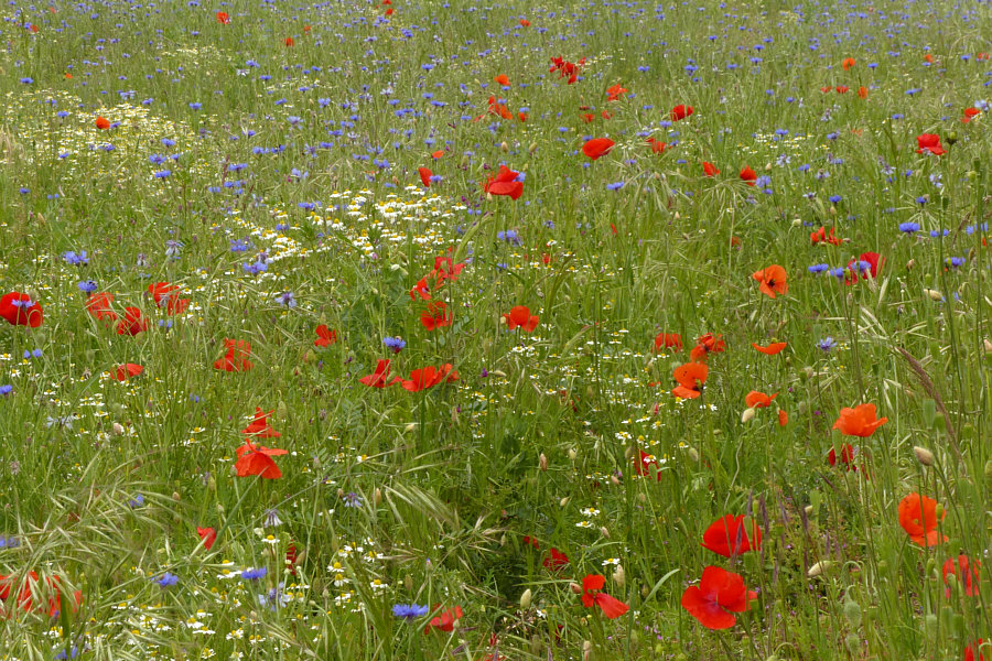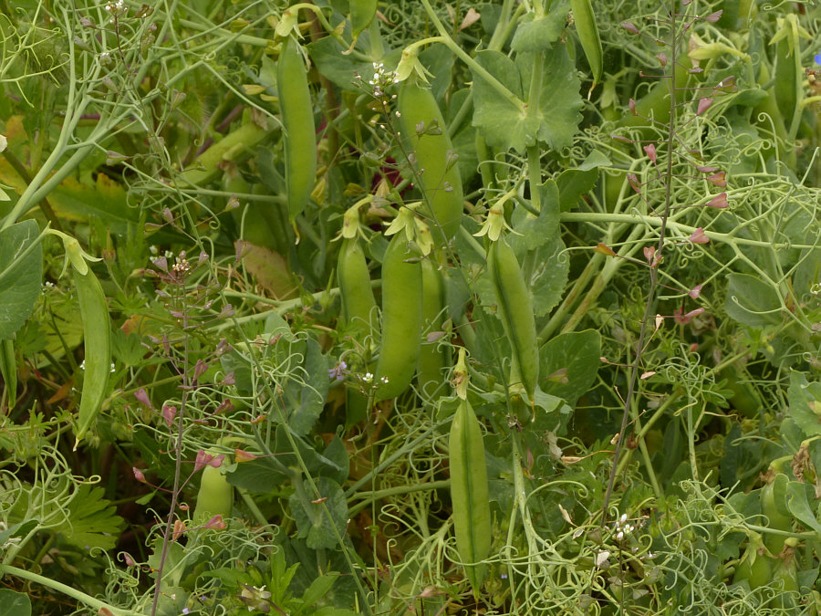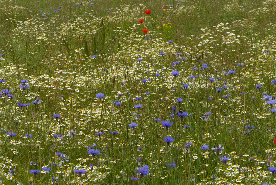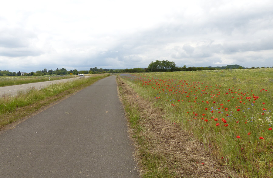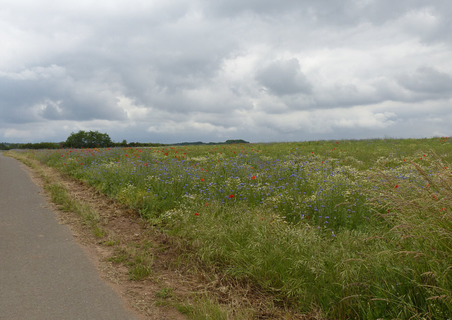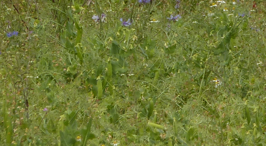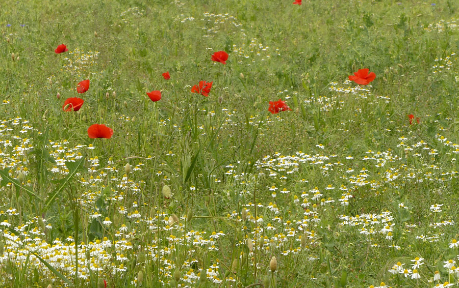 Wir laufen weiter (Fortsetzung von gestern) ... ![]() ... auf unserem Weg ... und wir sind nicht alleine ... ![]() ... denn ... wsch wsch wschwsch ... Autos fahren an uns vorbei. Unser Weg ist ein Fahrradweg, der parallel zur Straße verläuft. Normalerweise laufe ich solche Wege nicht, weil mich das ständige Vorbeifahren der Autos nervt. Aaaber ... ich bin ja ne Viertelstunde zuvor auch im Auto hier vorbeigefahren ... und weil ich da was gesehen habe, bin ich auf den Parkplatz gefahren, damit ich das, was mir auffiel, fotografieren kann. Und wenn ich etwas von der Straße aus sehen kann, dann ist das halt so, dass hier wsch wsch Autos vorbei fahren. Schawamm drüber. Hmm ... ich stelle gerade fest, dass ich die Spannung nicht noch mehr erhöhen kann, ich muss jetzt zeigen, was es da zu sehen gibt ... erstmal das Übersichtsbild: Deswegen bin ich hier ... ![]() ... wegen dieser wilden Mischung aus ... ![]() ... Mohnblumen, Kornblumen und Kamille. Eine Wiese, in der noch eine ganz große Überraschung verborgen ist (Spannung wieder aufbau). Aber zuerst schauen wir uns diese wunderschöne Mischung mal genauer an: ![]() ![]() ![]() ![]() Hier auf dem Bild ist die Überraschung schon zu sehen ... ![]() ... unten im Bild. Denn das ist gar keine wilde Wiese, wo einfach wächst, was wachsen will. Das ist ein Feld, in dem etwas ganz gezielt ausgesät wurde: ![]() Kann mans erkennen ? Wir stehen vor einem ... ![]() ... Erbsenfeld. Da hier keine Schädlingsbekämpfung stattfand, konnten Mohn, Kamille und Kornblumen ebenfalls wachsen und wurden höher als die Erbsen, die klein blieben, weil es so trocken war. Normalerweise werden sie größer und stützen sich gegenseitig und können so besser geerntet werden. Die meisten kennen Erbsen ja nur TK oder aus dem Glas oder der Dose. Oder getrocknet. So sehen sie aus, wenn sie auf dem Feld wachsen. ![]() Wir ernten mal eine Schote davon ... ![]() ![]() ![]() Ich hätte mir also mein Mittagessen mitnehmen können. Oder sie einfach als rohen Snack essen. Aber ich wusste ja nicht, ob die gespritzt waren. Waren sie nicht, aber das habe ich erst später erfahren. Und auch, dass sie als Winter-Eiweiß-Futter für die Kühe angepflanzt worden sind. Wir gehen weiter ... ![]() ... nicht ohne immer wieder einen Blick auf ... ![]() ... Kornblume ... ![]() ... Mohnblume ... ![]() ... und Kamille zu werfen. Ganz normale Gräser gibts auch ... ![]() ... und die werden natürlich auch fotografiert. So ... wir verlassen nun den Asphaltweg ... biegen rechts ab ... ![]() ... und laufen ... morgen ... diesen Weg weiter. (wird fortgesetzt) |