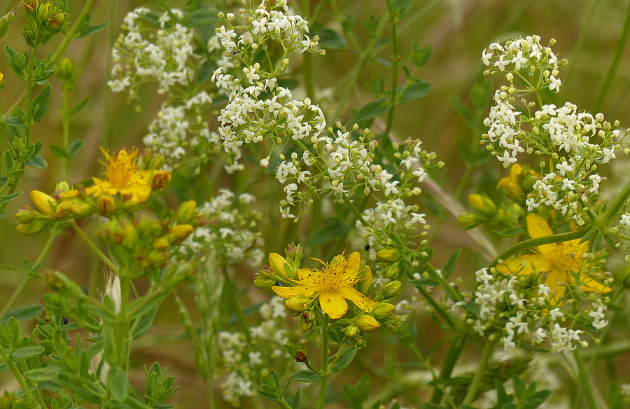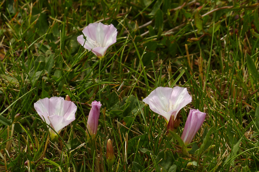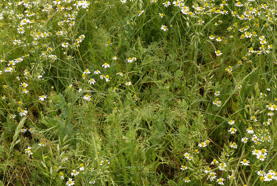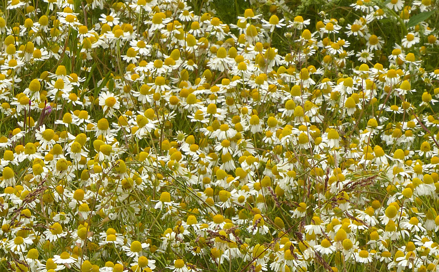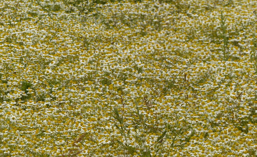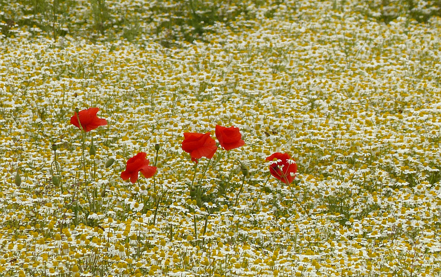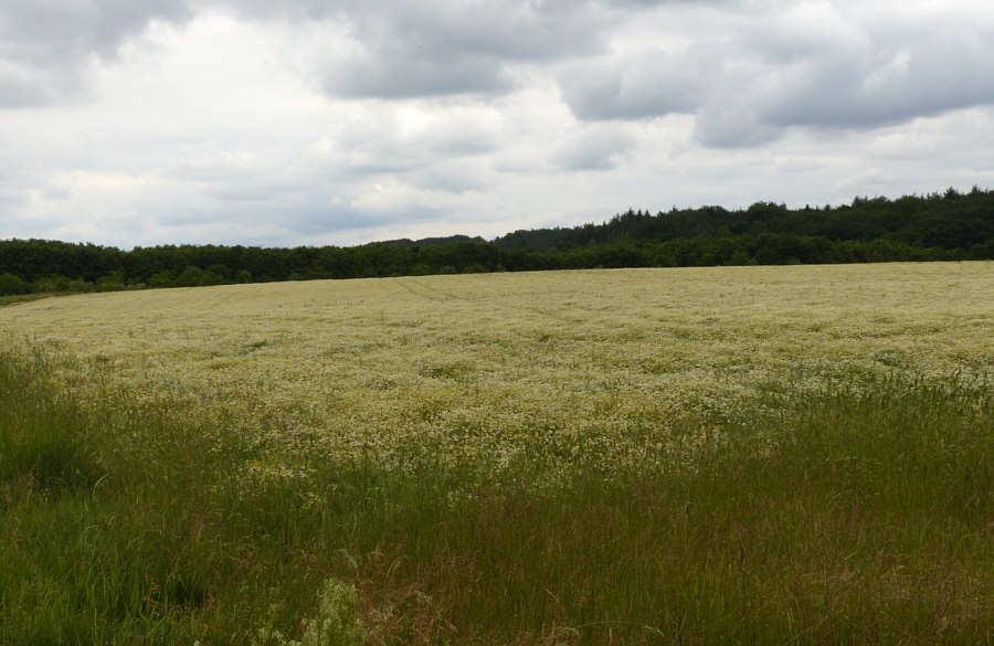 Wir laufen weiter (Fortsetzung von gestern) ... ... und biegen nun mal ab ... vom Asphaltweg auf diesen Weg: ![]() Was uns wohl hier begegnen wird ? Oder: was uns wohl hier blühen wird ? Erstmal noch nix ... darum gehen wir weiter ... ![]() ... durch ziemlich dichtes Gras. Das Auge freut sich auch mal ... ![]() ... über ein weites, offenes Land. Ebenso über Heckenrosen ... ![]() ... und kleine weiße Blümchen ... ![]() ... die unsere Schritte begleiten. Wir biegen wieder rechts ab ... und laufen nun diesen Weg ... ![]() ... hmm ... was ist das da hinten ... Sand ? Wir laufen weiter ... ich glaubs ja nicht ... das Weiße da hinten ... ![]() ... das ist alles Kamille !! ![]() Sowas habe ich jetzt ... ![]() ... aber auch noch nicht gesehen. Nur ab und zu lockern ein paar Gräser ... ![]() ... das weiße Meer aus Blüten auf. ![]() Ich verneige mich vor diesen kleinen Schönheiten ... im wahrsten Sinne des Wortes, denn will man sie besonders schön einfach, muss man sich zu ihnen runterbeugen: ![]() ![]() ![]() Auch dieses Kamillemeer ... ist eigentlich ... ![]() ... ein Erbsenfeld. Aber nicht alles, was weiß ist, ist Kamille ... am Rande wächst auch das weiße Labkraut. Besonders fotogen mit kleinen andersfarbigen Kontrastblüten dabei: ![]() ![]() Noch einen Blick in Richtung Kamille ... wie toll, wenn da auch noch einzelne Mohnblumen mitten im Weiß blühen: ![]() Ich mag ja alle Blumen ... aber manche besonders ... und so eine fand ich auch hier: ![]() ![]() ![]() Das ist die Ackerwinde. Ein traumhafter und ganz besonderer Spaziergang geht nun zu Ende ... danke fürs Mitlaufen :)). |
