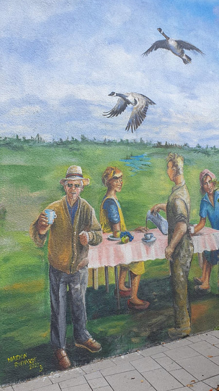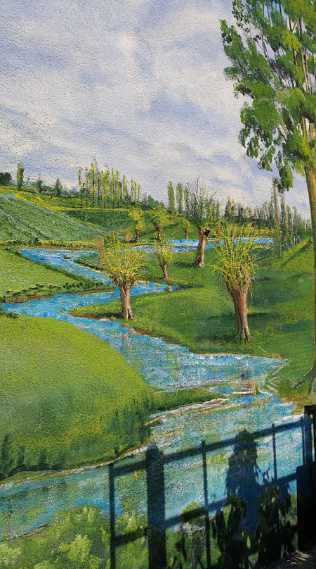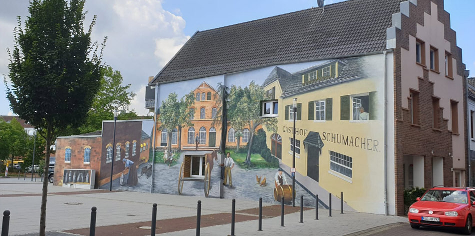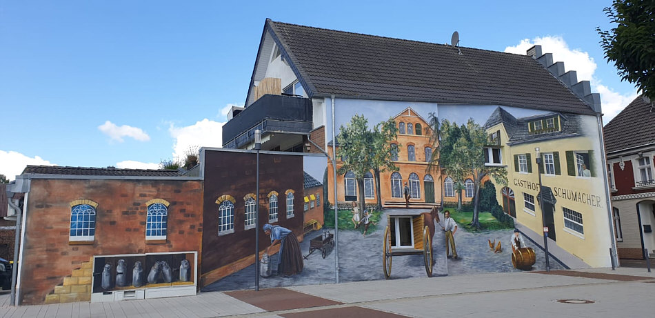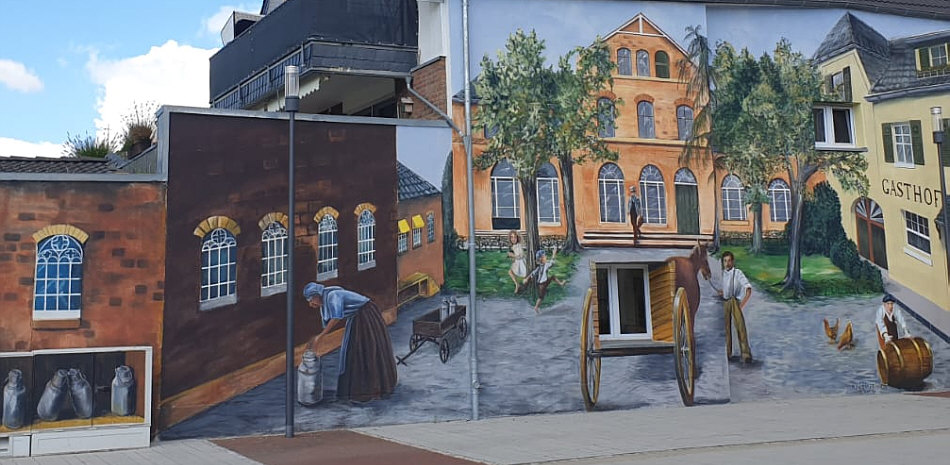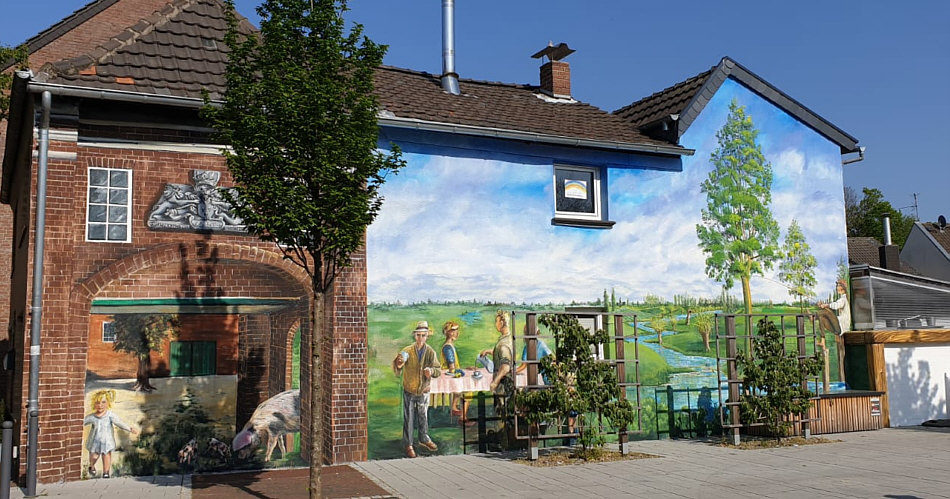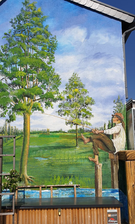 Seelenfärblerwoche heute: Der steinerne Hochkantfluß Wir sind heute bei Karin v. N. unterwegs ... ... in ihrem Ort gabs mal ein Gasthaus. Laaange her ... steht nicht mehr ... ist nur noch Erinnerung. Und damit die nicht verblasst ... wurde die Erinnerung an eine Hauswand gemalt: ![]() ![]() Das Haus von der anderen Seite: ![]() Auf der gegenüberliegenden Seite gibt es auch ein bemaltes Haus: ![]() Der Mann mit Hut ... ![]() ... ist ein Issumer Original. Zufrieden, ja fast glücklich ... sieht der Angler aus ... ![]() ... und das hier ... ![]() ... ist der "steinerne Hochkantfluss" :). |