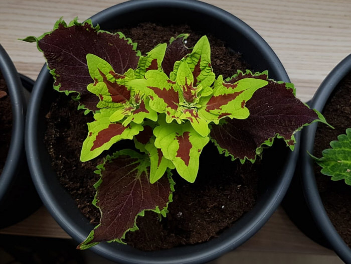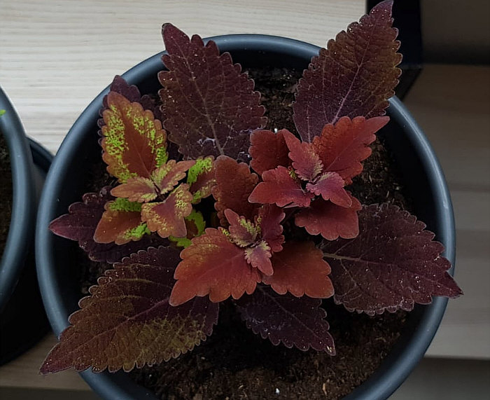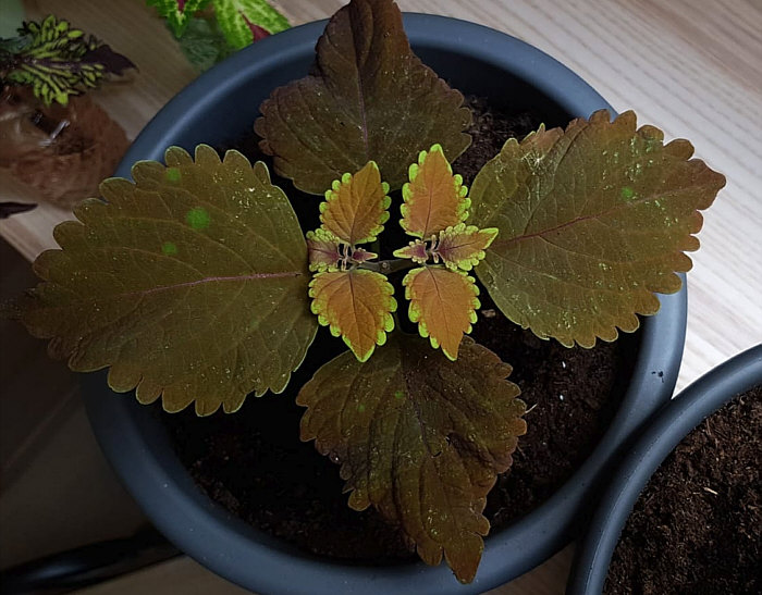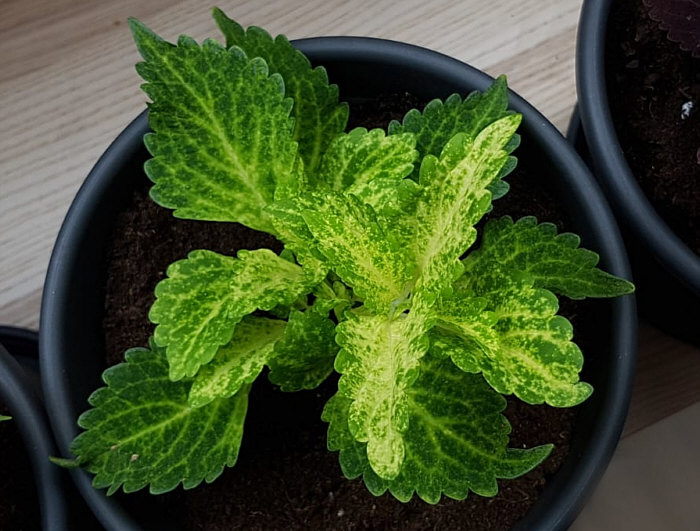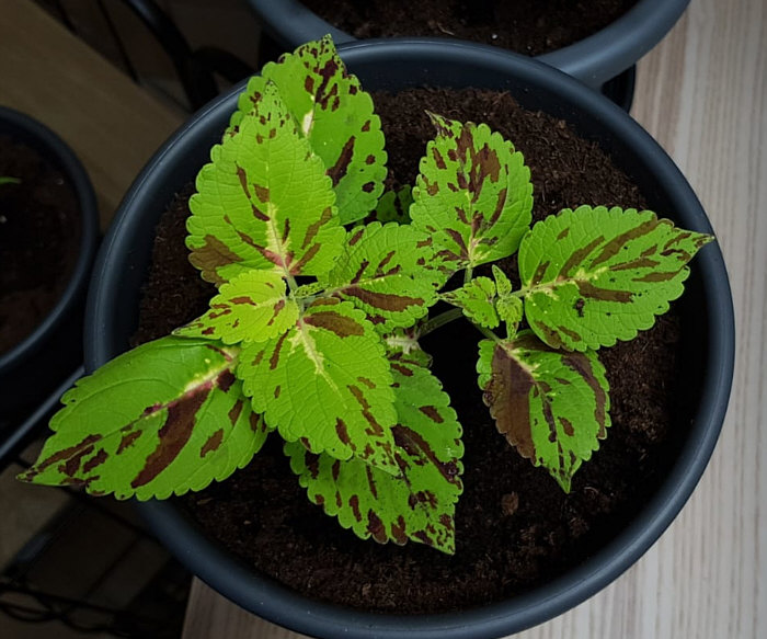 Ich hätte jetzt gedacht, dass das vor 2-3 Wochen war, ab die Zeit vergeht schneller als man denkt. Denn es ist knapp 5 Wochen her, als die Ursel diesen Kommentar ins Tagebuch schrieb: ![]() Ich hatte damals das geantwortet: ![]() Nun haben wir "ein paar Tage gewartet" und ich kann die Nesselchen zeigen. Alles Ableger, die mir irgendwie zugeflogen sind ;)) ... und die ich wurzeln ließ. ![]() Ich zeige mal 5 davon (zwei sind fast gleich): ![]() Hier kann man eines schön sehen ... wie viel Einfluß Tageslicht auf Buntnesseln hat. Die Ursprungspflanze stand im Freien, von der städtischen Gärtnerei in Landstuhl in einen der öffentlichen Pflanzentürme gesetzt. Dort hatte sie den ganzen Tag von morgens bis abends Tageslicht. Je heller es ist, desto höher der dunkle Anteil der Nesselchen. Wenn es weniger Licht ist, in der Wohnung z.B., dann erhöht sich der Grünanteil und so sind die neuen Blätter nicht dunkelrot, sondern heller rot mit grün. Das sieht man hier besonders schön ... ![]() ... draußen rot mit schmalem grünen Rand ... drinnen breiter grüner Rand mit rot in der Mitte. Auch hier sind die neuen Blätter heller ... ![]() ... während das bei rein grünen Buntnesseln nicht so stark auffällt: ![]() Besonders schön finde ich diese Variante ... ![]() ... die sogar dreifarbig ist ... grün, dunkelrot, cremefarben. Und dazu ganz unregelmäßig gemustert ... wie die impressionistische Version einer Buntnessel. Das sind noch recht kleine Pflanzen ... hier ist meine große Buntnessel, die ich wirklich nicht mehr "Nesselchen" nennen kann ;)). ![]() Von ihr habe ich auch eine Detailaufnahme für Euch: ![]() Das ist schon die zweite Generation dieser Pflanze ... ich werde wieder Ableger machen. Die nächste Generation steht übrigens auch schon bereit ... ![]() ... von 12 gesäten Samen sind 8 aufgegangen. Hier ist das ganz spannend, welche Farbe bzw. Musterung diese Nesselchen haben werden. Es gibt ja da sehr viele Variationen. Ich liebe Buntnesseln ... weil sie schön schnell wachsen, weil man sie leicht vermehren kann, weil mein nicht allzu grüner Daumen dafür ausreicht und weil sie so schön abwechslungsreiche Farben und Muster haben. |