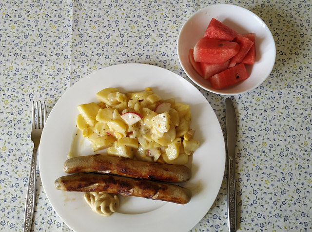Dazu Geflügelbratwurst aus Truthahnfleisch und Melone zum Nachtisch.