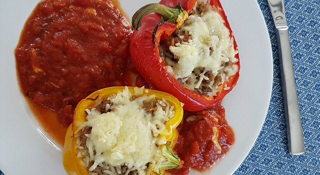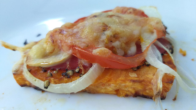 Geröstete Süßkartoffel mit Salami, Zwiebel, Tomate und Käse überbacken.