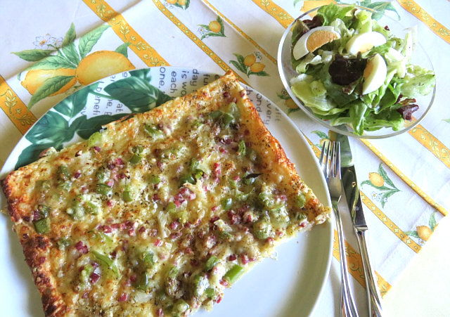 Flammkuchen mit grüner Paprika, Rohschinken- und Zwiebelwürfelchen sowie