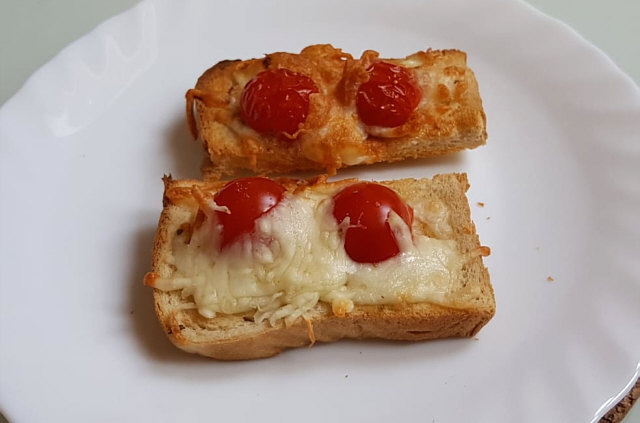 Kirschtomate und Reibekäse drauf ... kurz in der Heißluftfriteuse