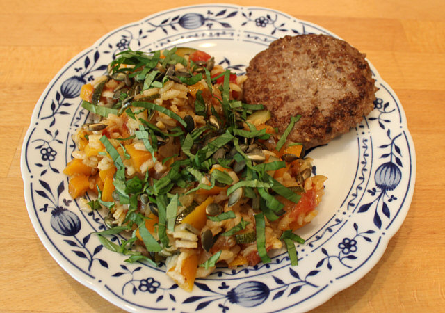Kürbisrisotto mit einer Scheibe Enten-Burger (sehr zu empfehlen, nicht