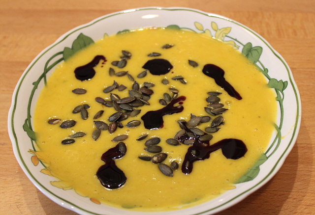 Kürbiscremesuppe mit Steirischem Kürbisöl und gerösteten Kürbiskernen.