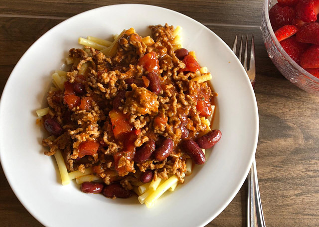 Chili con carne mit kurzen Makkaroni und als Nachtisch Erdbeeren