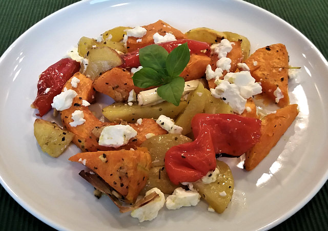 Gemüse im Ofen gebacken: Kürbis, rote und gelbe Paprika, Kartoffel,