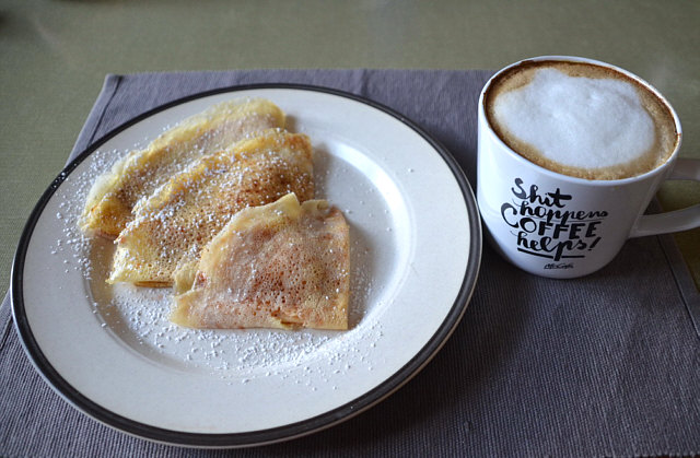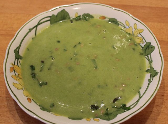 Heute gab es eine pürierte Suppe aus grünen Erbsen mit Krabben und