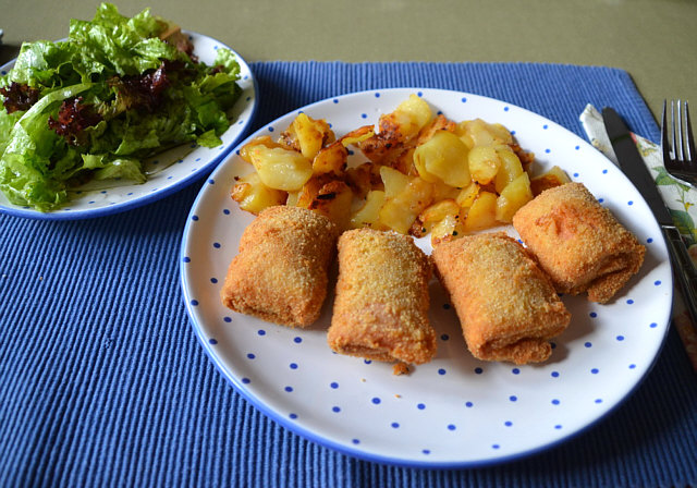 Gebackene Leberkäseröllchen, gefüllt mit Käse, Bratkartoffeln, Salat