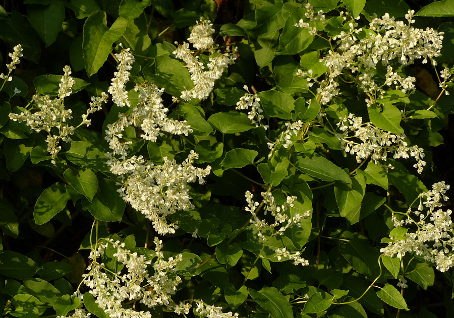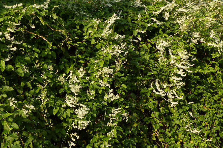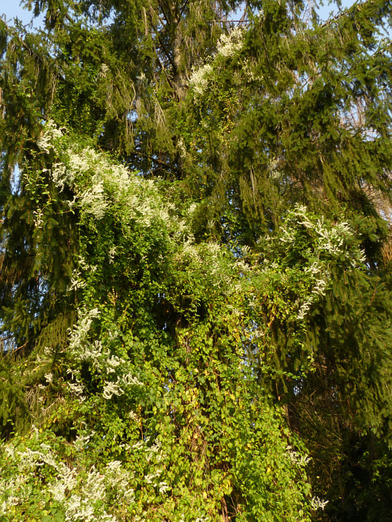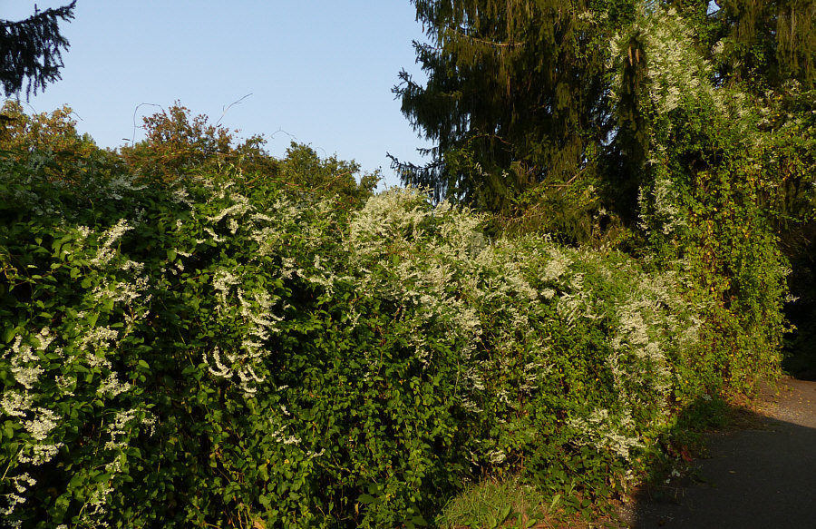 Die Pflanze, die ich heute vorstelle, steht für mich für das Wort Wuchsfreude Denn mehr Freude am Wuchs geht nicht ... bis zu 30 Zentimeter am Tag (!!) wächst der Schlingknöterich Es ist kein Problem, ihn im Garten zu haben ... aber nur wenn man einen Platz dafür hat. Dort soll dann nix anderes wachsen müssen ... vielleicht vor einer hässlichen Wand, die dann ganz schnell vom Knöterich bewachsen wird. Er gilt als unerwünschter Neophyt ... man sieht ihn häufig an Schallschutzwänden, die er schnell be- und überwuchert. Seine positiven Seiten sind, dass er eine gute Bienenweide ist, die eine sehr lange Blütezeit, bis in den Oktober hinein, hat. Man sollte nie so eine Pflanze entfernen wollen, denn bei bis zu 3 Meter langen Wurzeln ist das sehr aufwändig. Man kann ihn aber radikal und großzügig zurückschneiden. Der Worte folgen nun ein paar Bilder: ![]() Hier wuchert er eine Hecke entlang ... ![]() ... und einen Baum hoch hinauf. ![]() ![]() ![]() ![]() ![]() |