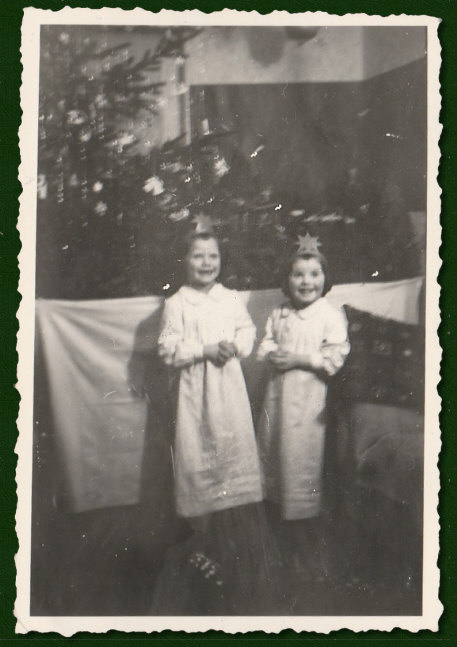 Das sind meine jüngere Schwester und ich zu Weihnachten – vermutlich 1958 –