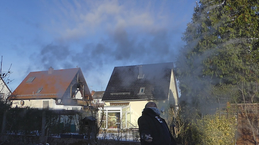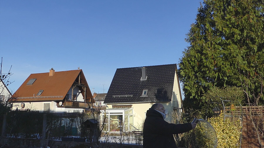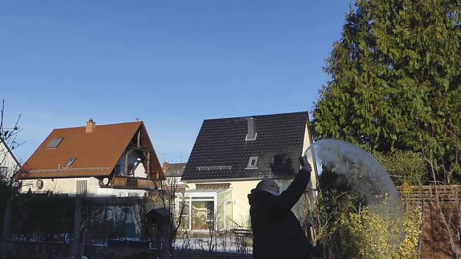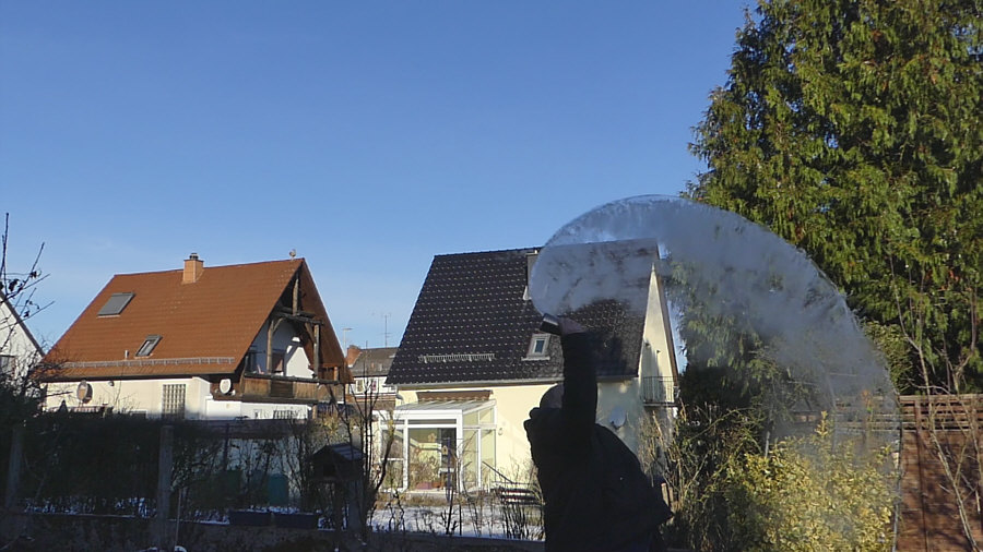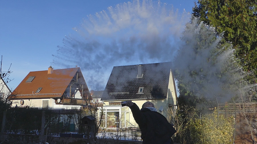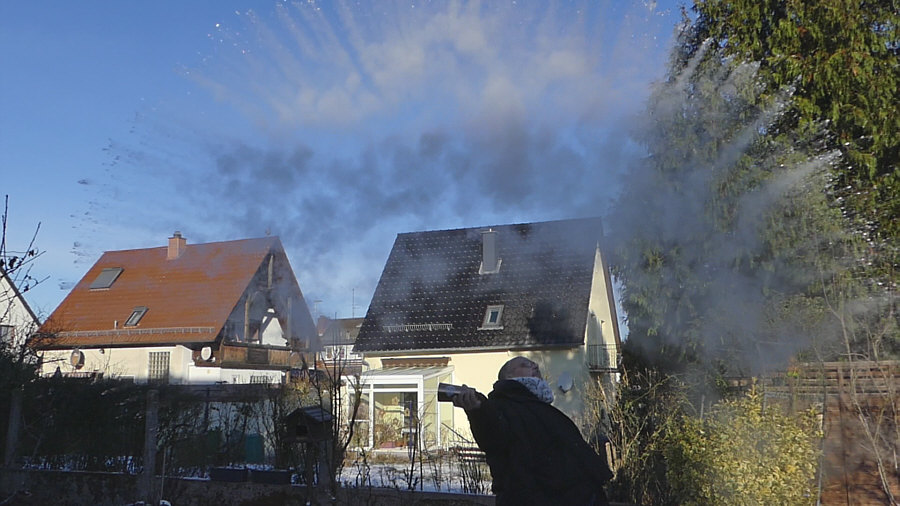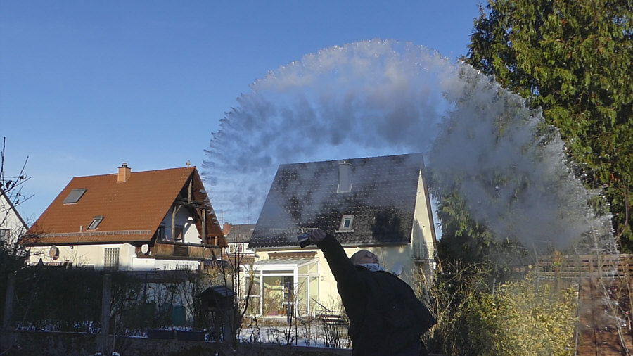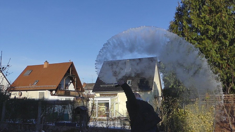 Gestern Morgen um 9.20 Uhr ... minus 8 Grad ... ![]() ... gebückter alter Mann steht bei uns im Garten. Fällt er gleich nach vorne ? Muss er aufs Klo ? Ist er erfroren ? Auf einmal kommt Bewegung in den Herrn ... ![]() ... er richtet sich auf ... er lebt ! Er richtet sich noch mehr auf ... ![]() ... und er hält etwas in der Hand. Segnet er den Garten ? Fällt ihm seine Wasserschorle aus der Hand ? Hui ... jetzt wird er schneller ... ![]() ... da ist ja noch richtig Leben in ihm ... er schleudert das ... ![]() ... was in dem Becher ist, in Richtung Himmel. Heißes Wasser ... das bei dieser Kälte sofort zu Schneestaub wird ... ![]() ... erst zur Schneeschnecke ... dann zum Staub ... ![]() ... man beachte seine anmutige Haltung ... ob er gleich nach hinten fällt ? Der Schneestaub-Bogen wird immer größer ... ![]() ... und der Schnee immer staubiger. ![]() Der Mann findet langsam zur Ruhe ... ![]() ... das ehemals heiße Wasser ist zu ganz feinem Staub geworden ... der Becher leer ... der Film im Kasten. Beate, das hast du gut gemacht. Denn aus diesem kleinen Videofilm habe ich diese Bilder extrahiert. Ein Bild war zwar schon im Tagebuch, aber ich habs wieder rausgenommen, weil ich dachte, dass ich die ganze Bilderserie zeigen sollte. |