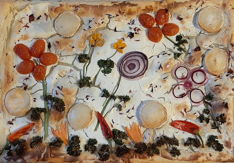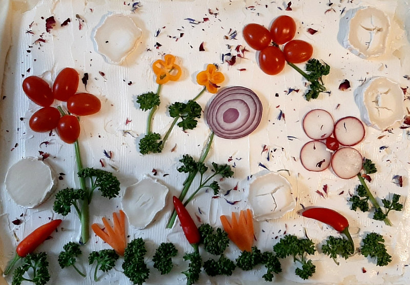 Das ist Blätterteig mit Frischkäse bestrichen und mit Gemüse und
