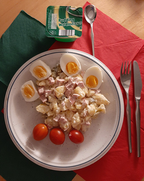 Kartoffelsalat angemacht mit Miracel Whip, Gurken und Fleischwurst.