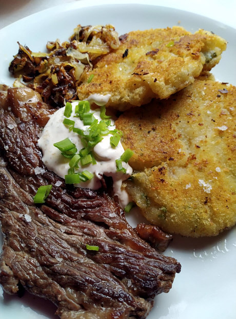 Steak und die Kartoffelplätzchen aus der Rezepte-Rubrik.