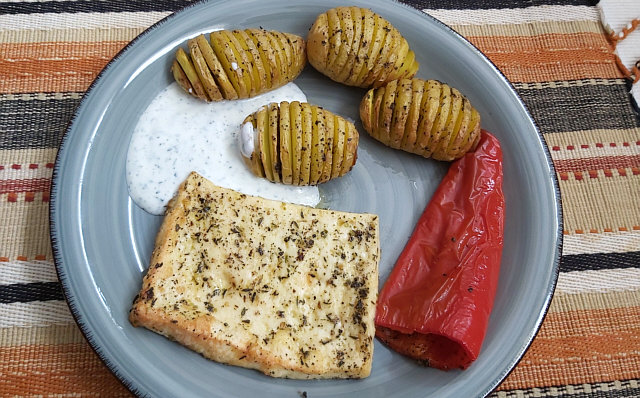 Alles im Backofen gebraten: Fächerkartoffel, Bratkäse, roter