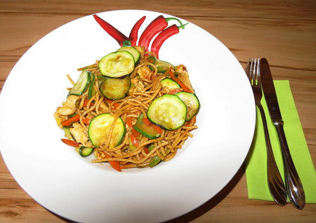 und Zucchini-Scheiben in einer Asia-Würzmischung (zubereitet im Wok).