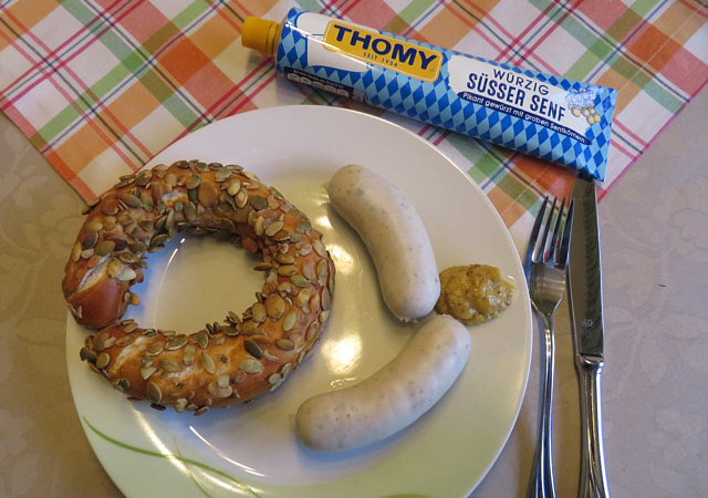 Münchner Weißwurst mit süßem Senf und einem Kürbiskern-Laugenring ...
