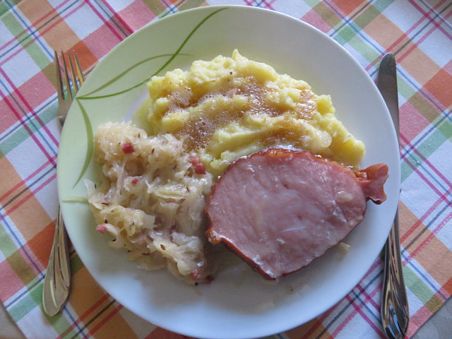 Geschmorter Kasselerbraten mit Sauerkraut (mit Speck und Kümmelkörnern),