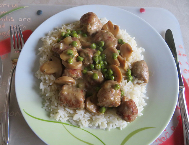 Gebratene Rinderhackklößchen in Rahmsoße mit Champignons und TK-Erbsen