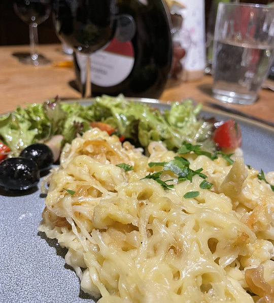Käsespätzle mit selbst gemachten Spätzle, zu denen eine Freundin aus