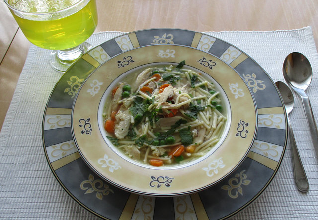 Hühnerklein gekocht, Suppennudeln extra gekocht, ein paar Erbsen und