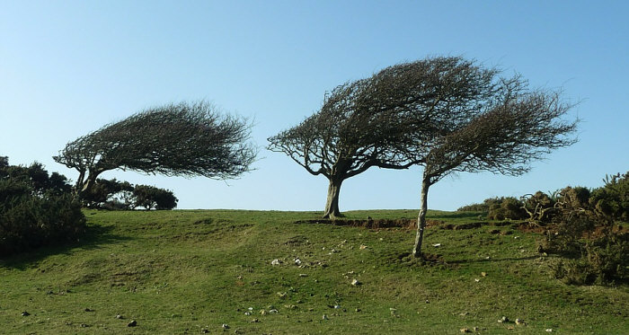 Ihre Kronen in Fluchtrichtung gebeugt zum Land,