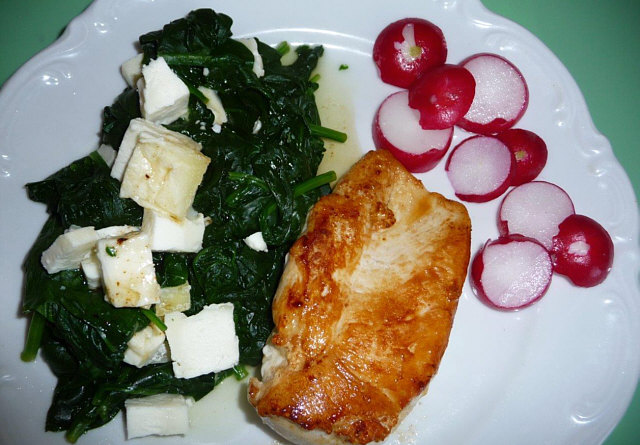 Frischer Blattspinat, blanchiert, mit Feta, gebratenes Hühnerfilet