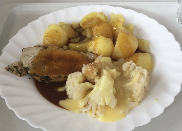 Kräuter-Schweinerücken mit Blumenkohl, Kartoffeln und Sauce.