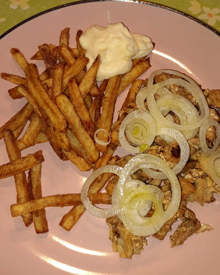 Selbstgemachte Pommes, Gyros, Knoblauchmajo und Zwiebelscheibchen.