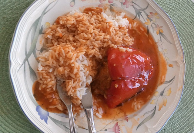Gefüllte Paprika mit Reis und Tomatensoße.