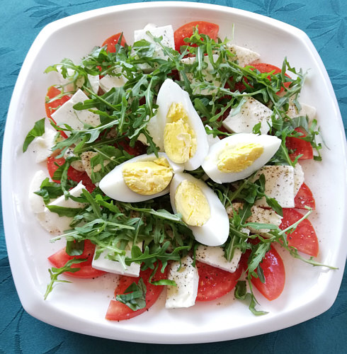Tomaten, Mozzarella, Fetakäse, Basilikum, Rucola und Ei.