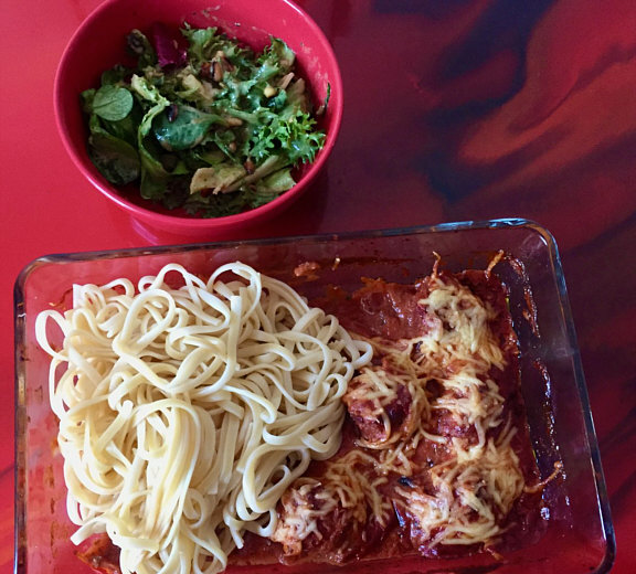 Hackbällchen in Tomatensauce mit Spaghetti und Salat.