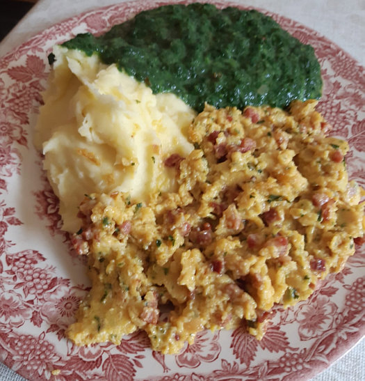 Püree, Spinat und Rührei mit Schinkenwürfel.