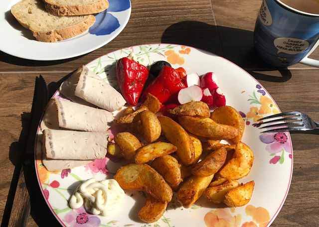 Dicke Fritten, Schweinefleischaufschnitt, Radieschen und Peperoni.