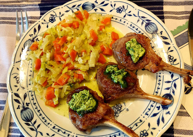 Lammkotelett mit Bärlauchbutter, Möhren-Porree-Zwiebel-Gemüse, mit