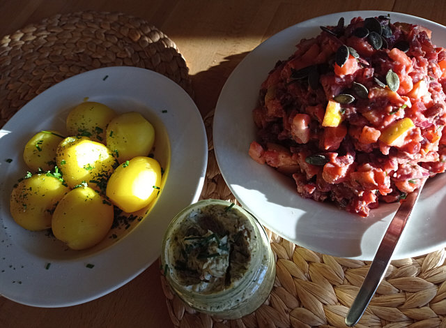 Selbst gemachten Matjessalat mit Kürbiskernen, dazu Pellmänner mit