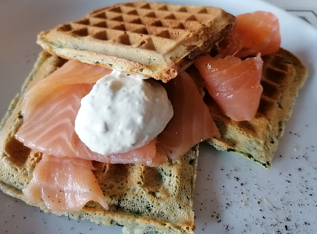 Spinatwaffeln mit Räucherlachs und Frischkäsedip.
