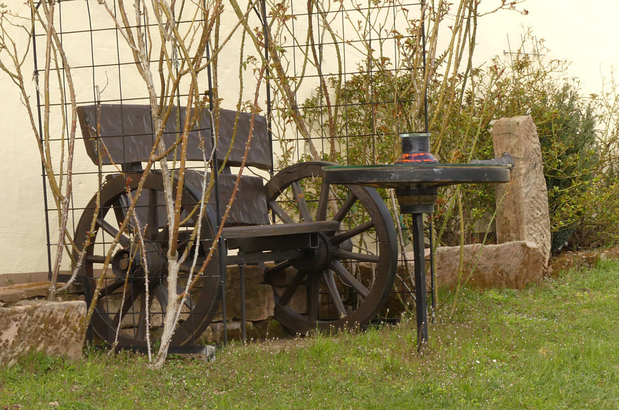 ... mit ganz individueller Bank und Tisch aus bzw. mit Wagenrädern.